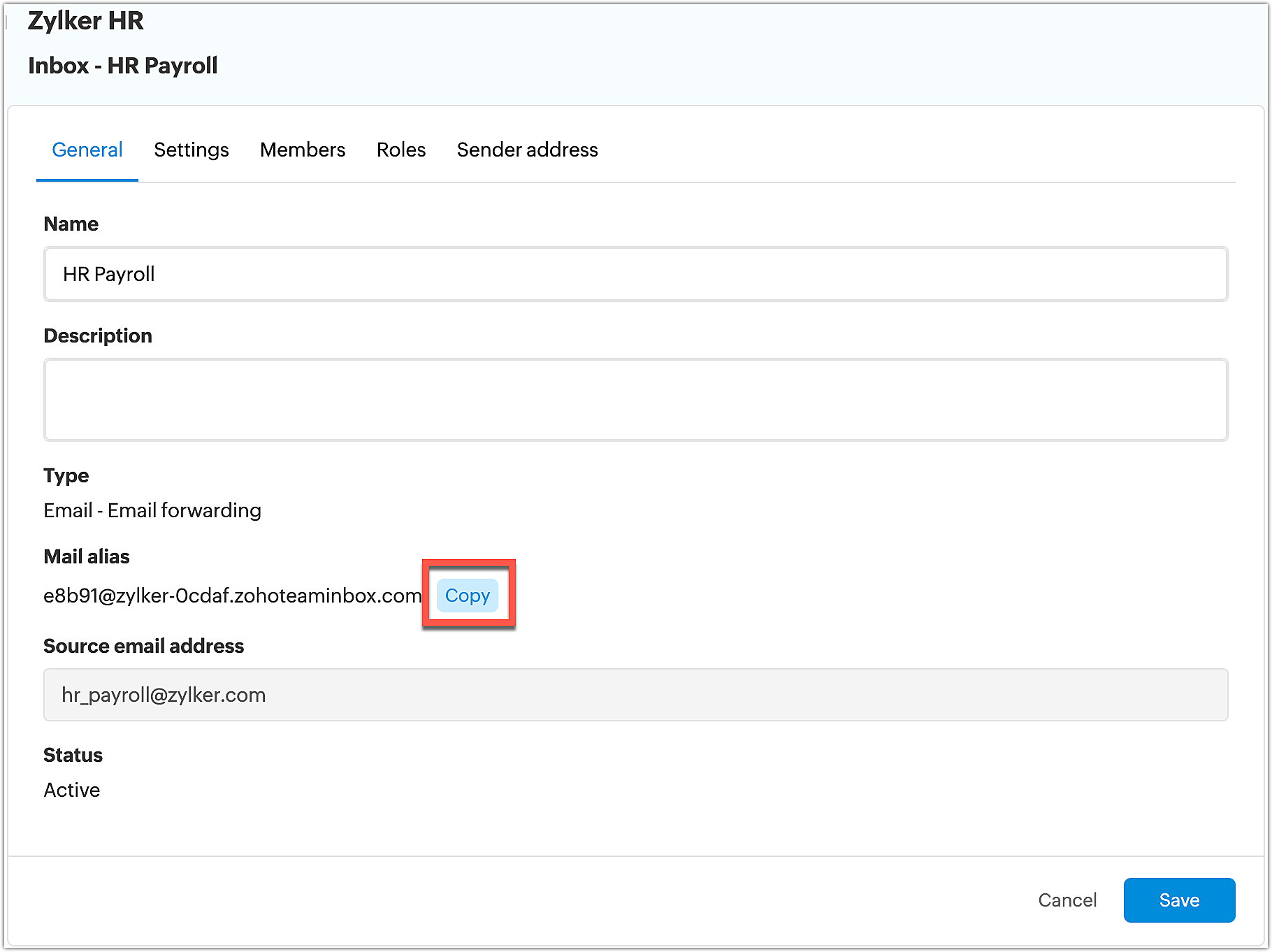 - Zoho TeamInbox generates a unique email forwarding address for this inbox. You can copy this address and use it to forward emails.