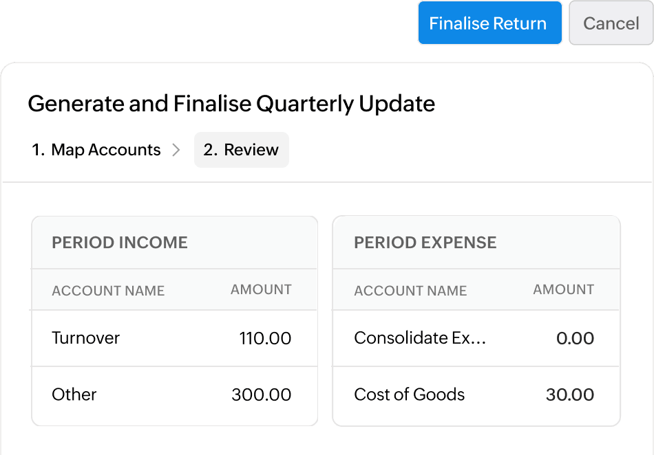 Based on your account, Zoho Books will let you know the consolidated income and expenses in the review page. You can review the numbers and then generate the quarterly update.