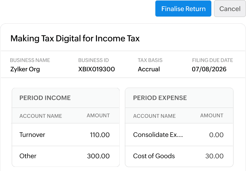 Zoho Books helps you stay connected with HMRC. Once your Zoho Books account is authorized, you can effortlessly manage Income Tax obligations and stay tax-season ready.