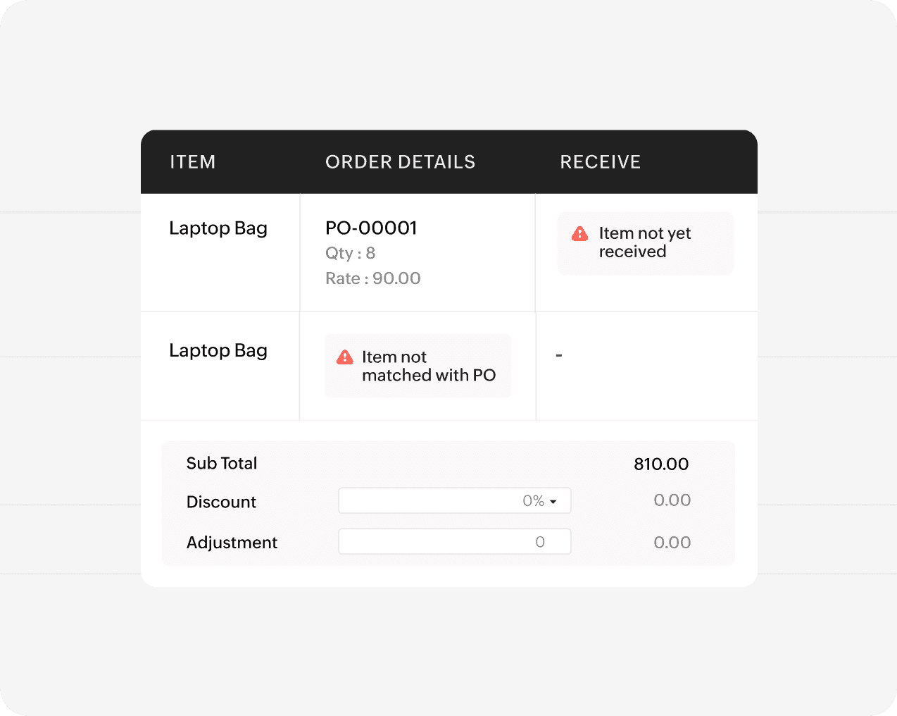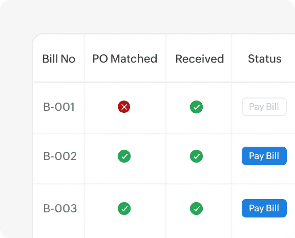 Compare bills with purchase orders and purchase receives. Spot any discrepancy in item quantities, rates, and PO existence and ensure you never overpay.
