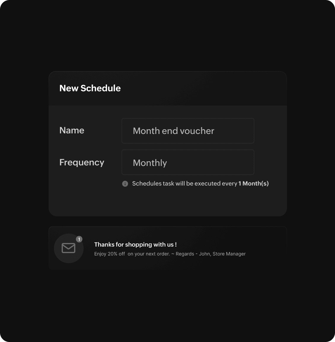 Schedule tasks to be executed at set intervals; from setting up periodic offers and sending month-end payment reminders to regular data sync and export, do it all! Minimize manual intervention and streamline business operations.