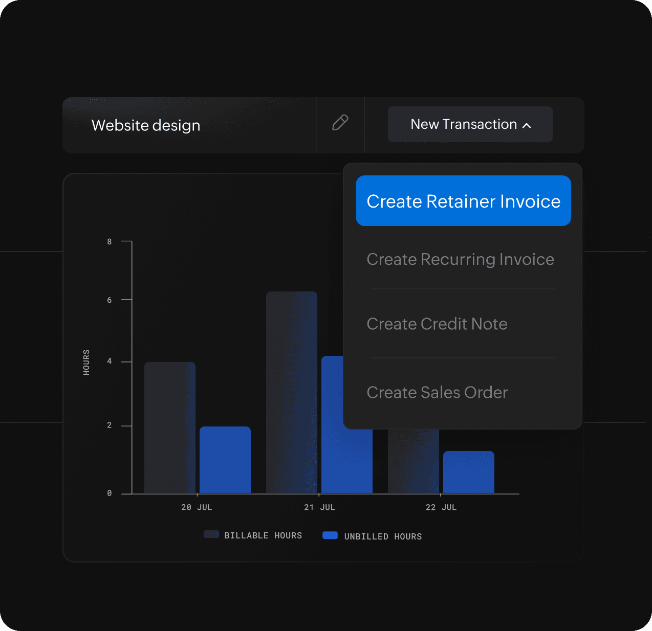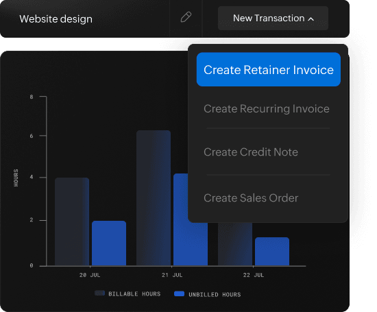 Monitor your projects in real time on your Zoho Books dashboard. This comes in handy when you don't have much time, but want to know where things are standing.