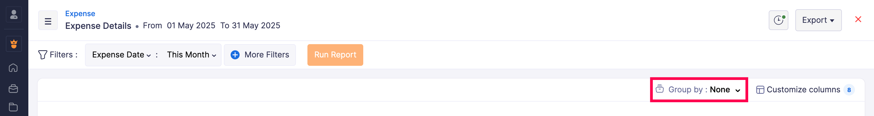 You can also select a parameter such as expense, unique code, predefined values, users, etc by which you want to group a report so that the data is categorized based on the selected parameter.