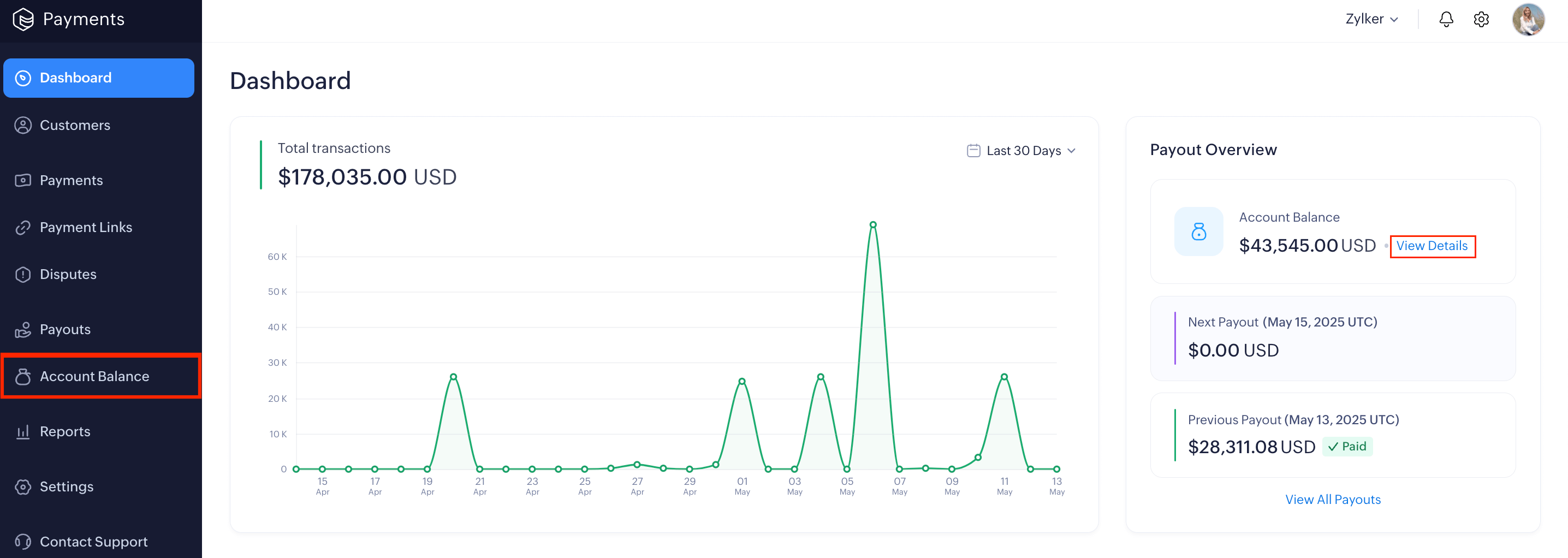 The Account Balance module in left sidebar of Zoho Payments provides a detailed overview of your funds, including amounts available for payout, funds held in reserves, and other balances. This module helps you monitor what makes up your account balance across different components, giving you better visibility and control over your cash flow in Zoho Payments.