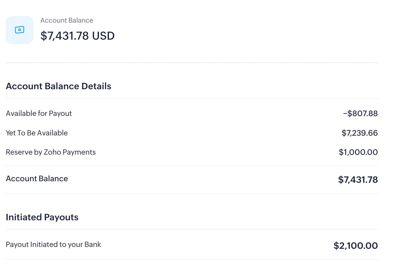 The Account Balance is the total amount of funds in your account, including all available, reserved, and future payouts. The account balance section provides an overview of your complete financial standing within your Zoho Payments account.