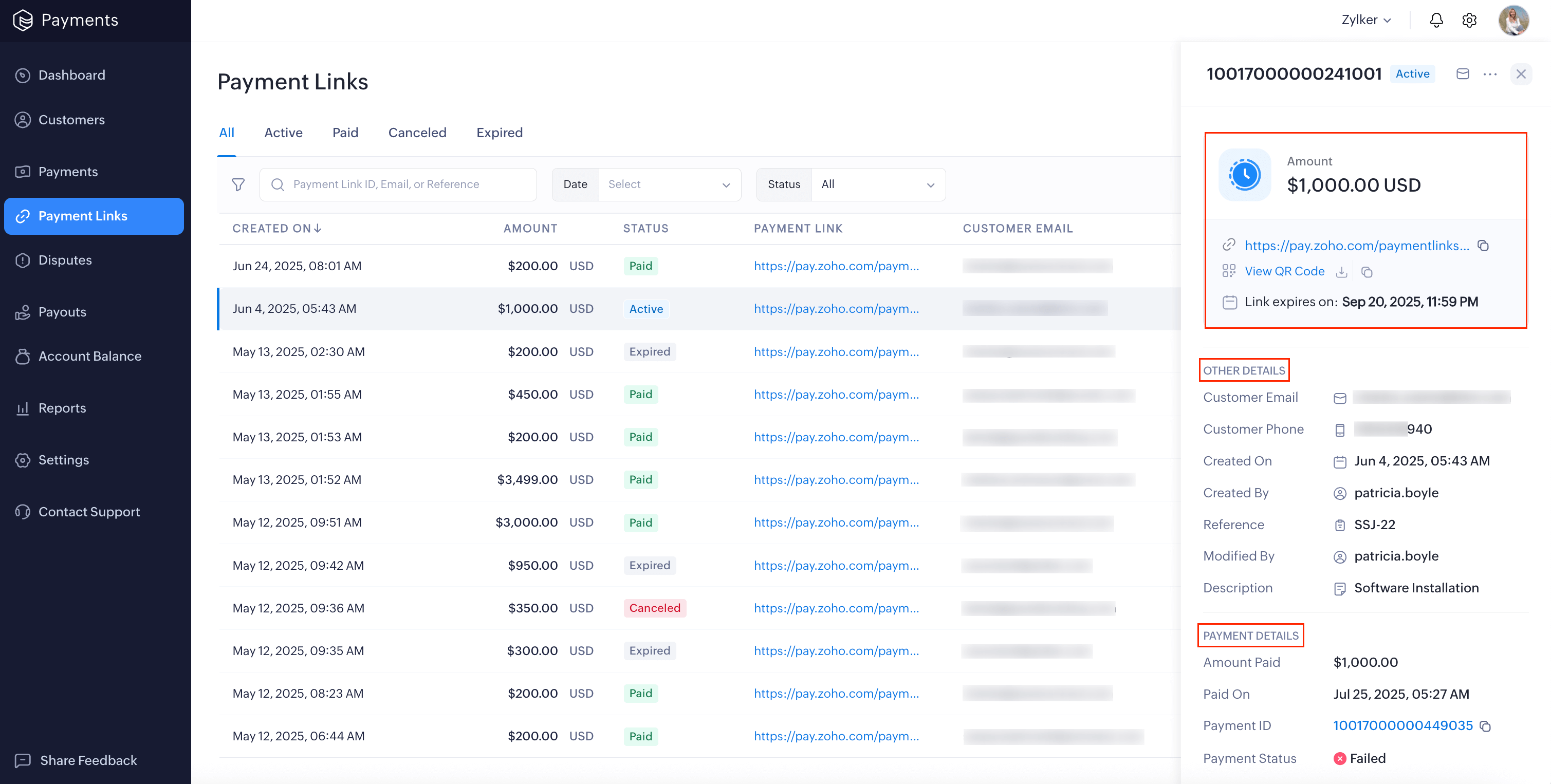 When you click the payment link, a side panel will appear where you can view details such as the Payment Amount, Generated Link, and Expiry Date.