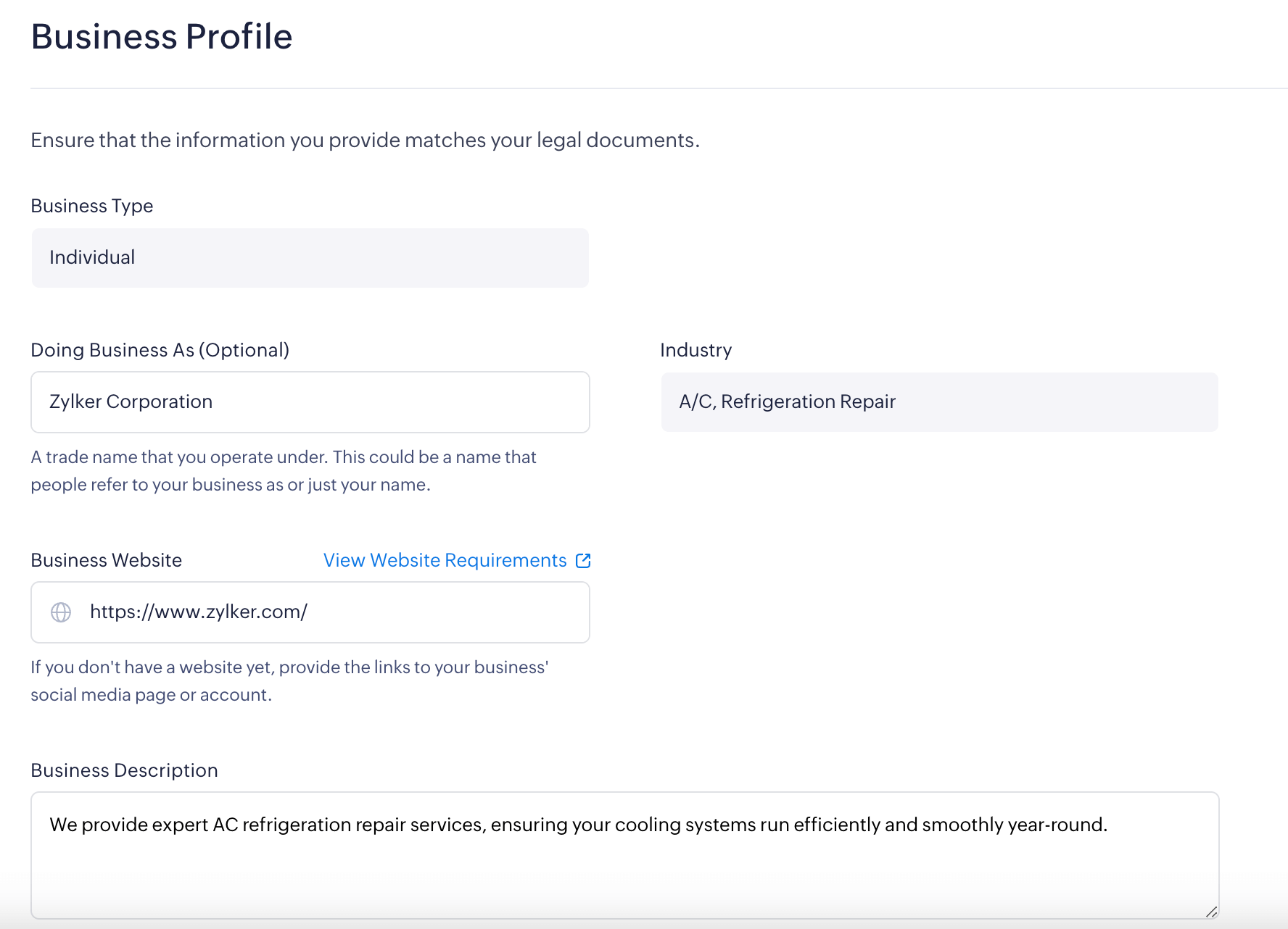 The basic business details that you provided while creating your Zoho Payments account will be displayed here. To view the details:
