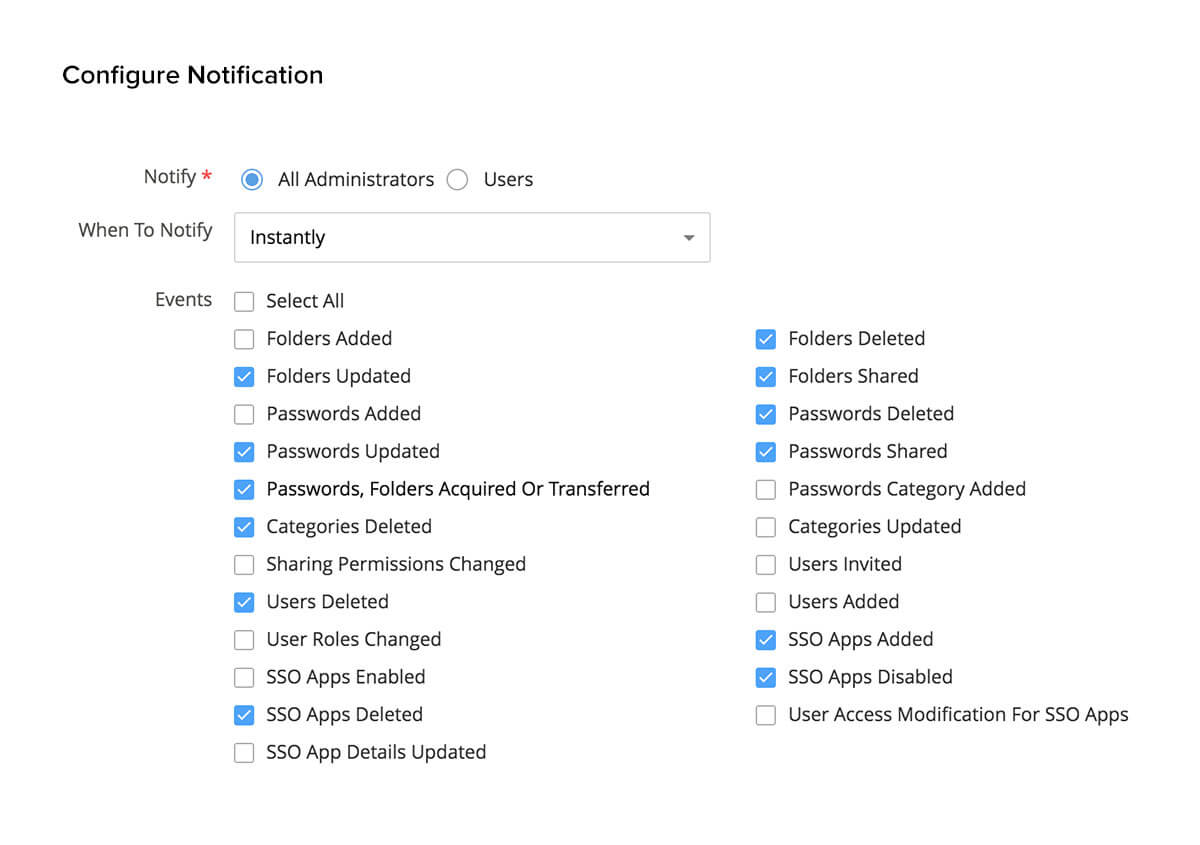 Want to stay up to date on all important events? Add additional security to your Vault by setting notifications for every action related to users, passwords, and folder management.
