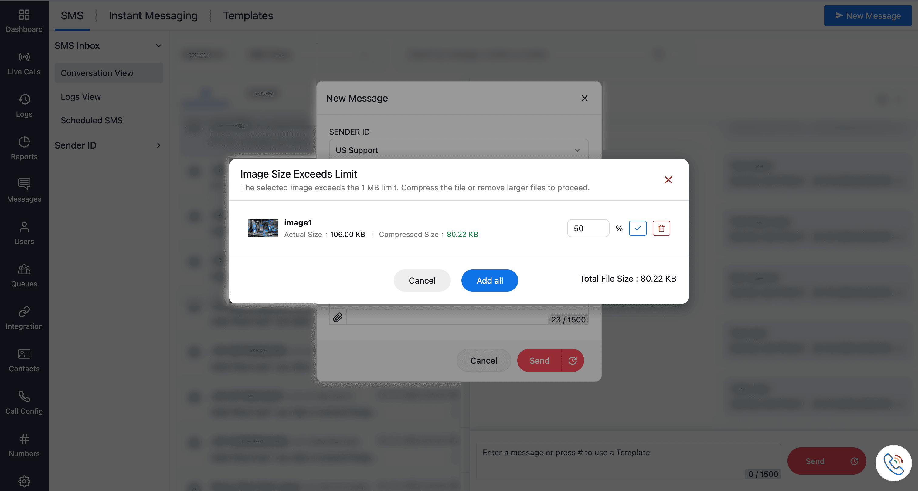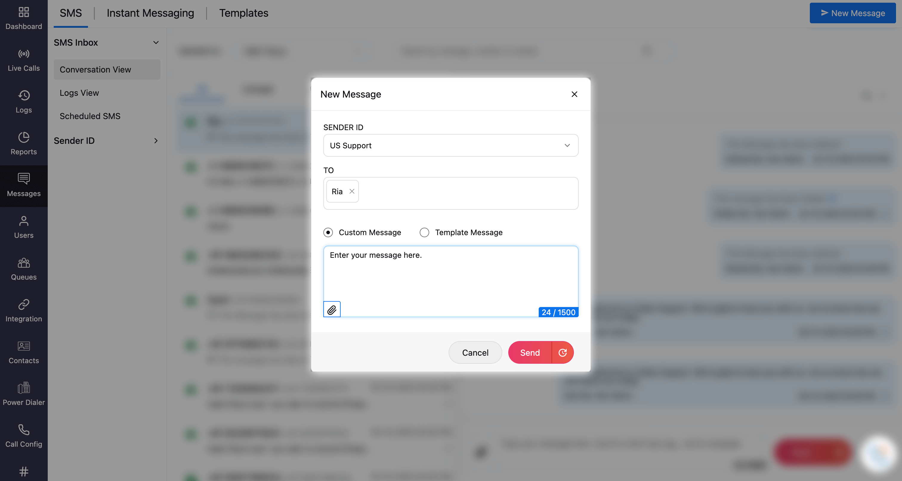 Once your number is SMS/MMS-enabled, you can send and receive SMS and MMS messages from the Messages module and carry out chat-like conversations with your customers and prospects using text and multimedia files.