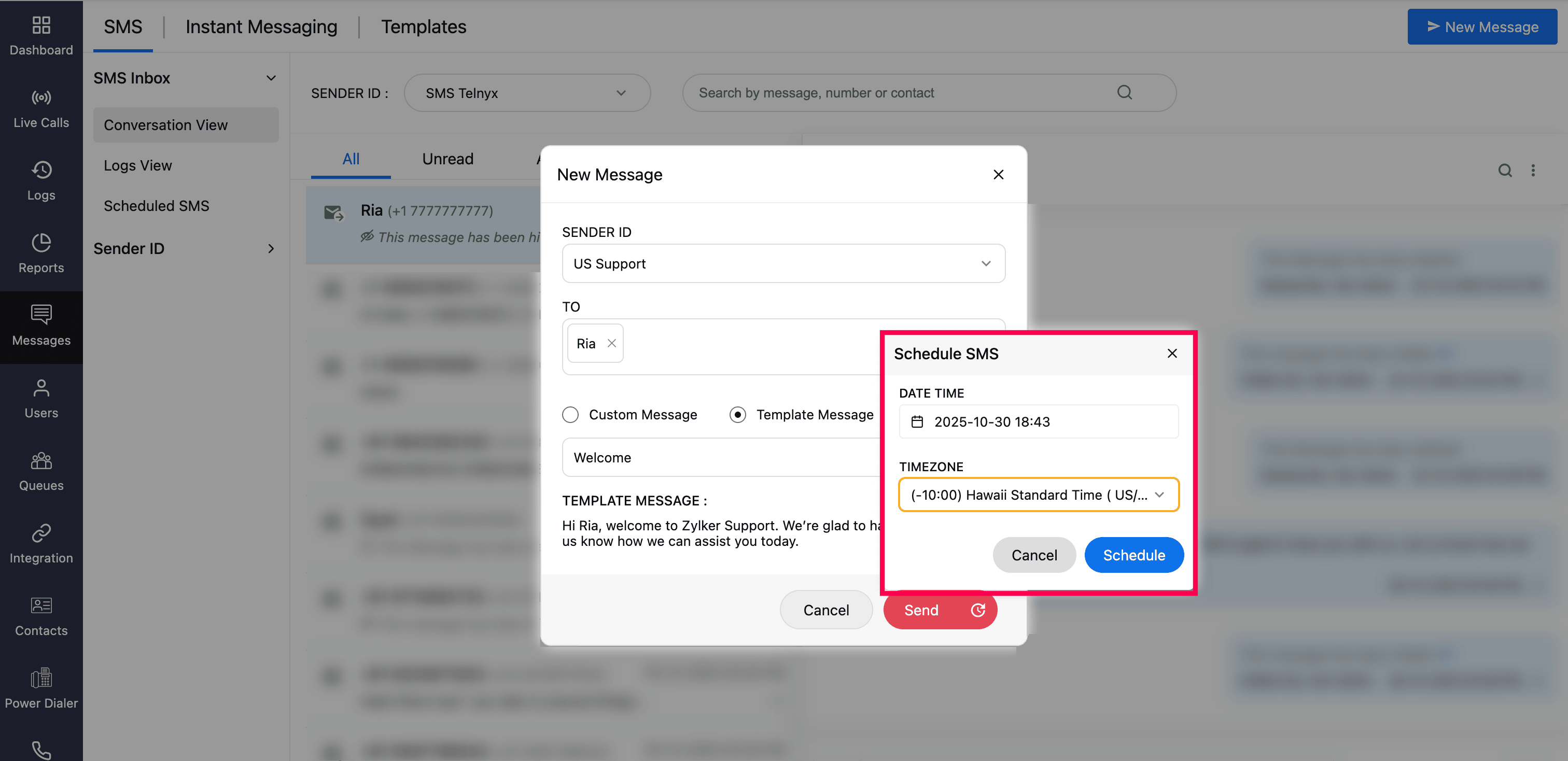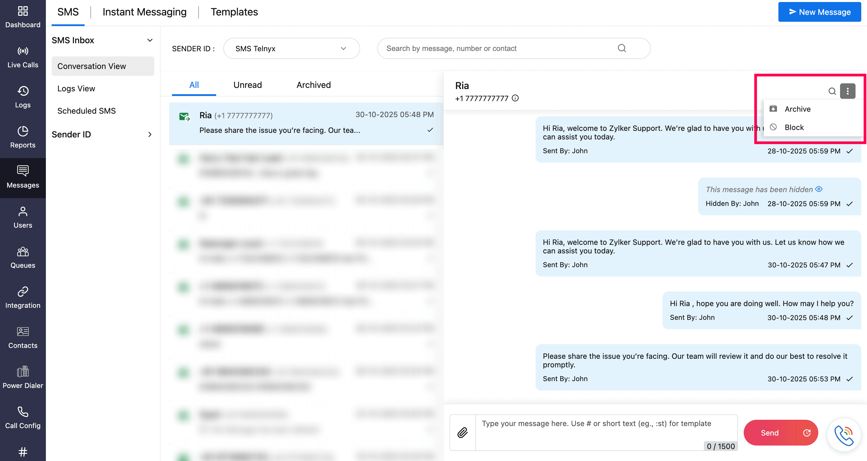 You can send SMS/MMS messages from the following locations in Zoho Voice: