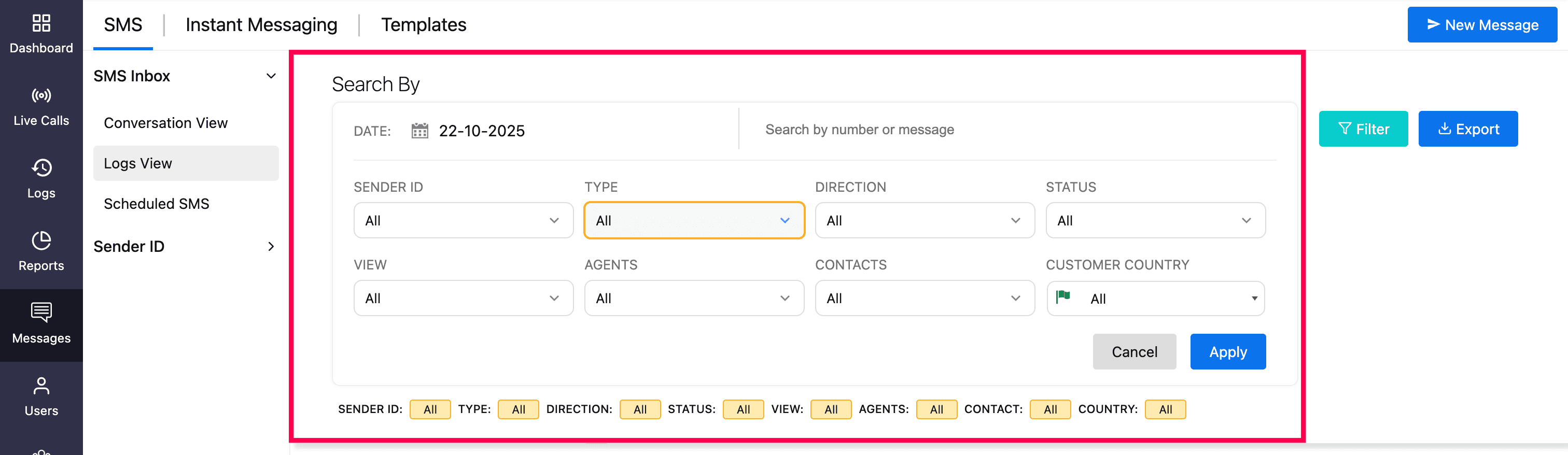 Use advanced filters to narrow down results by Sender ID, Type (All or MMS), Direction (Incoming or Outgoing), Status (Received / Delivered, In Queue, Not Delivered) , View (All, Archived), Agents, Contacts, and Customer Country.