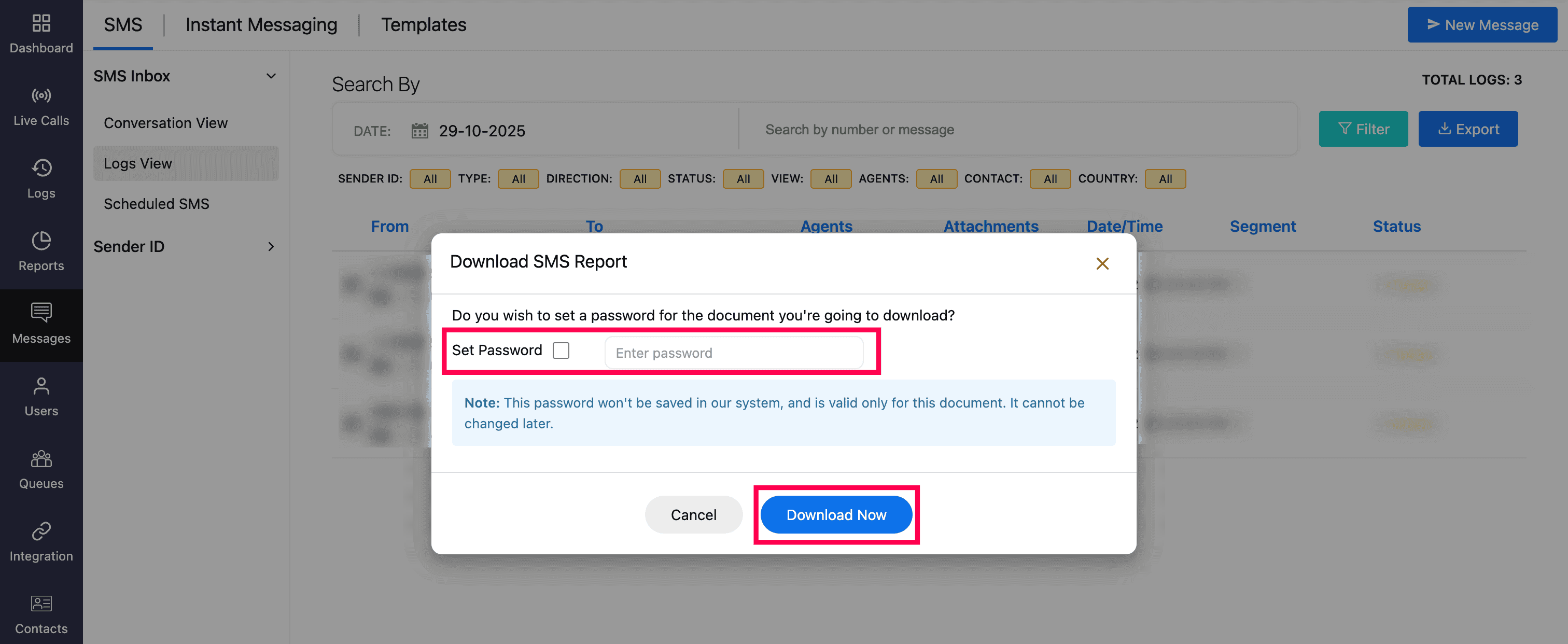 After applying the desired filters, you can export the report in CSV format by clicking the Export button. If required set password and click Download Now.