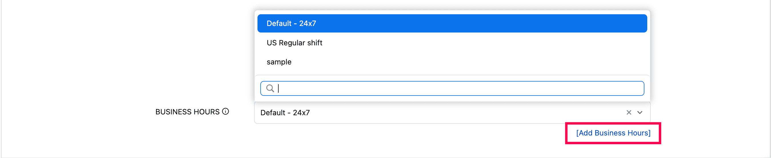 Business Hours: Select an existing profile from the dropdown or create a new one by clicking Add Business Hours. For detailed steps on creating a business hours and holiday profile, refer to this document. Once created, the profile will be listed in the dropdown for future use.
