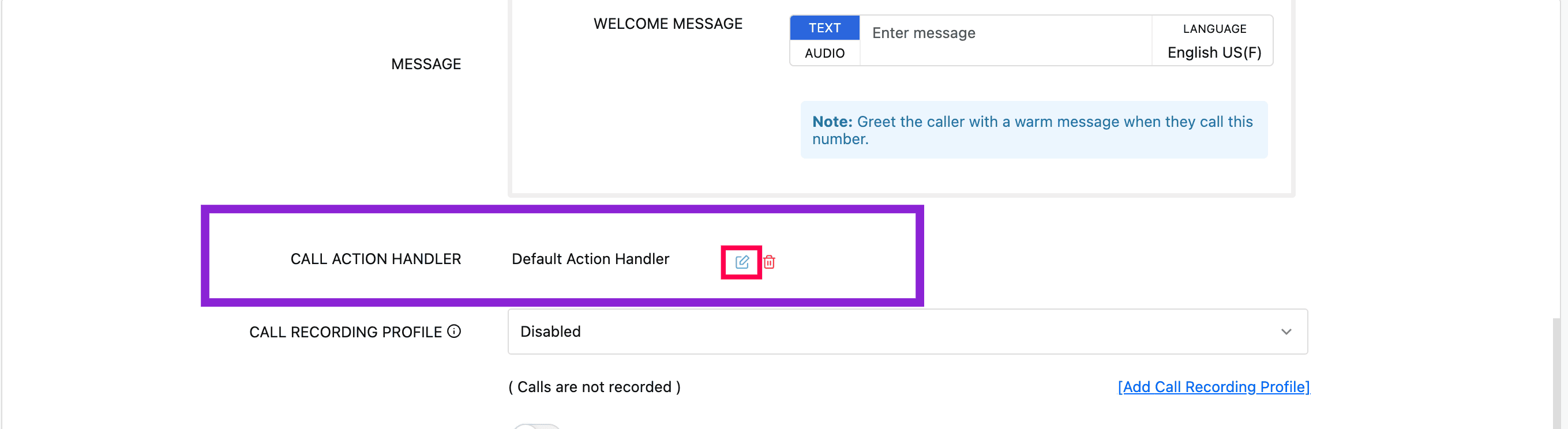 On the Call Handler page, edit the name if required.