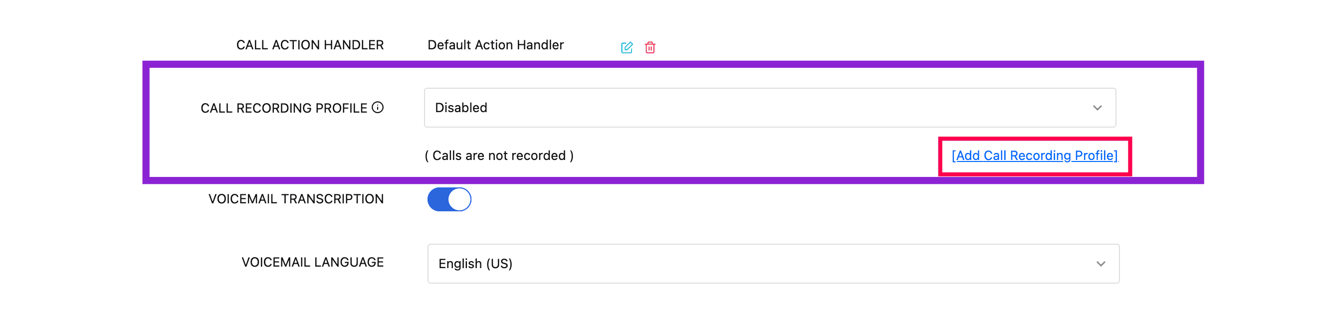 Call Recording Profile: Specify when call recording should be performed. You can choose to disable recording, select an existing profile, or create a new one by clicking Add Call Recording Profile. For detailed steps on creating a profile, refer to this document. Once created, the profile will be listed in the dropdown for future use.