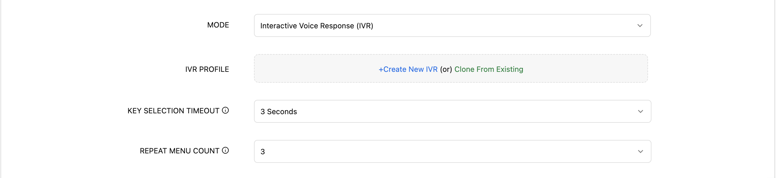 Key Selection Timeout: Defines the duration within which a caller must press a key. If no key is pressed, the IVR menu will be repeated.