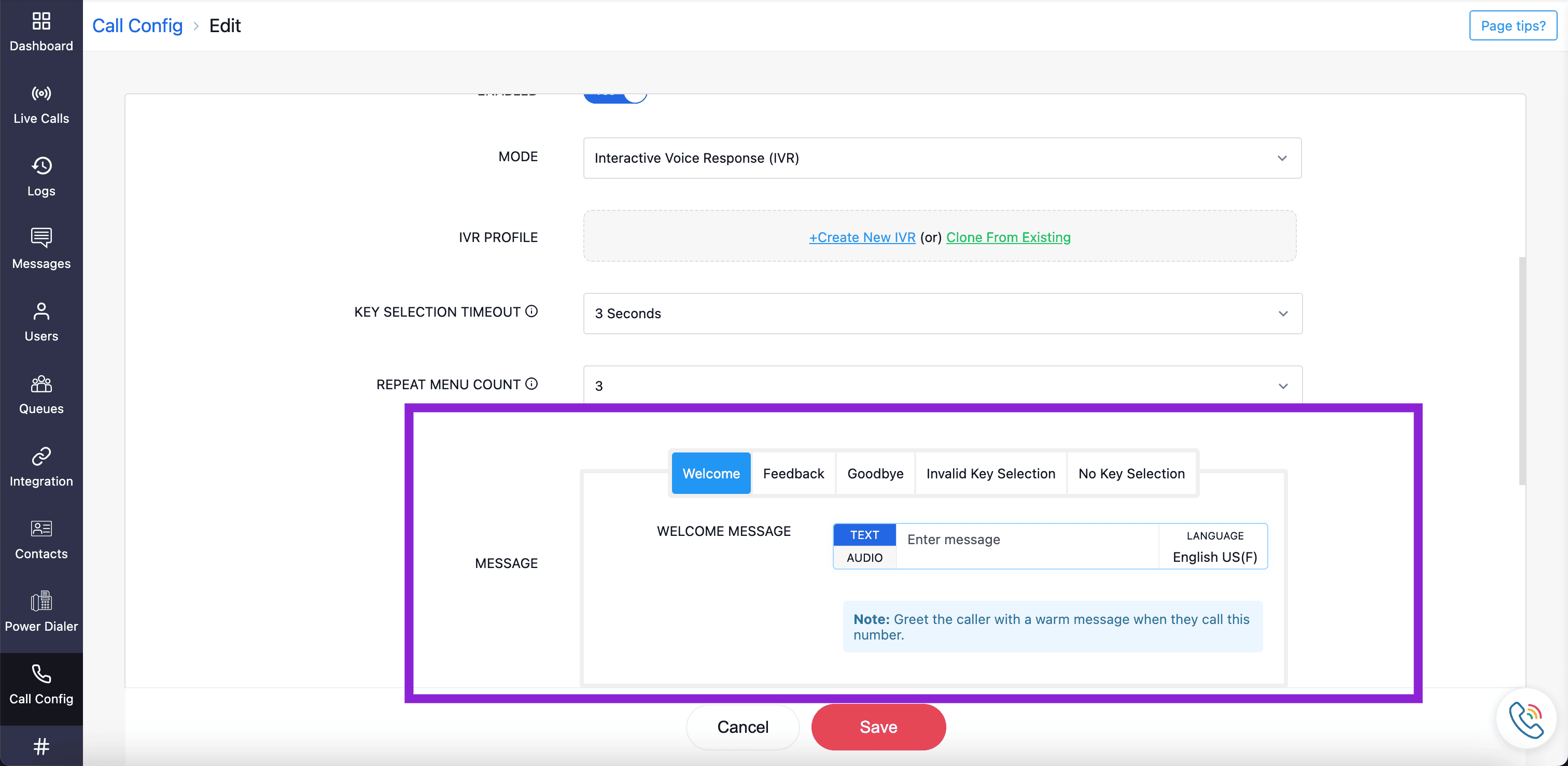 Once your mode configuration is set, you can continue to configure your welcoming, feedback, and goodbye messages for incoming calls to this number in the Message field.