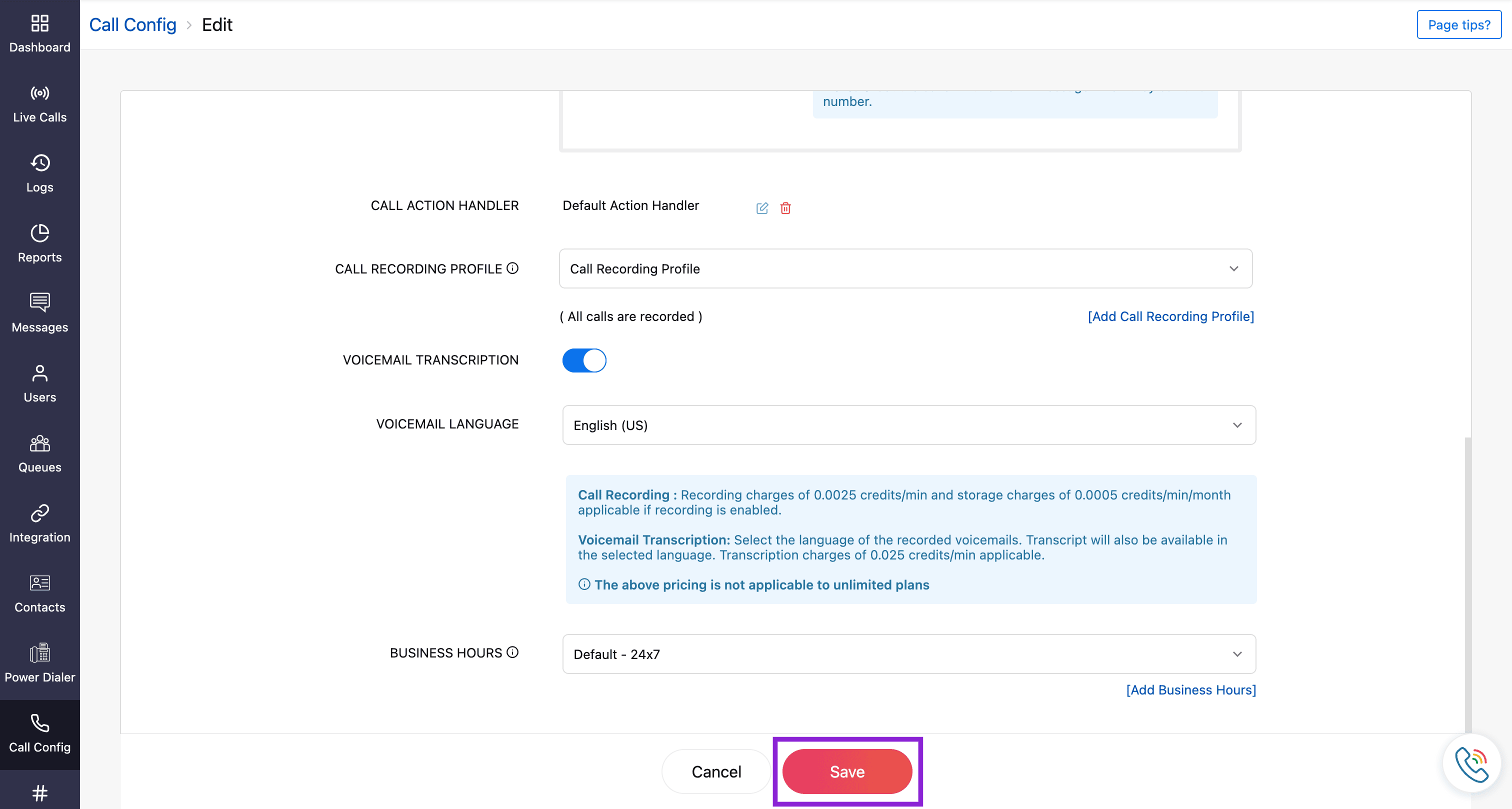 Here, you can choose to transcribe voicemails left by callers when incoming calls are missed, such as when agents are busy, unavailable, during holidays, or outside of business hours.