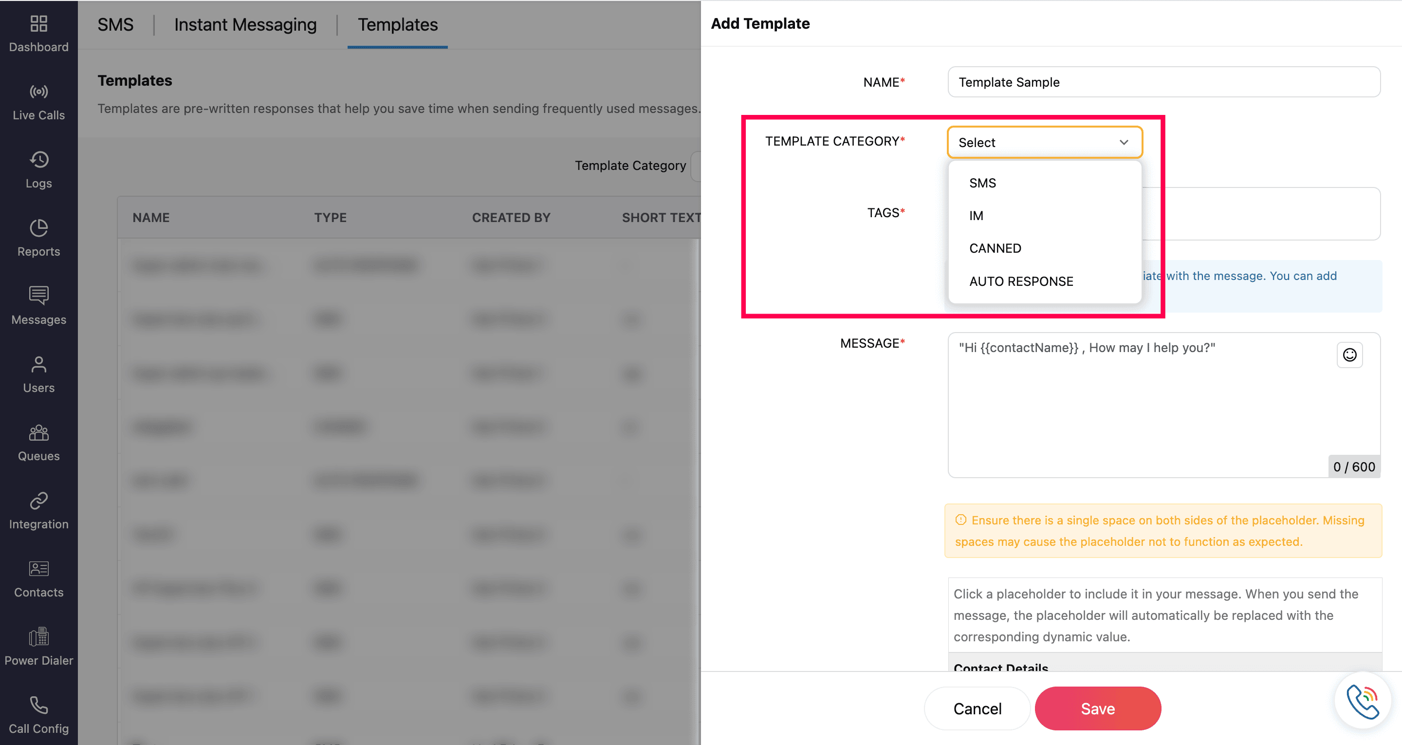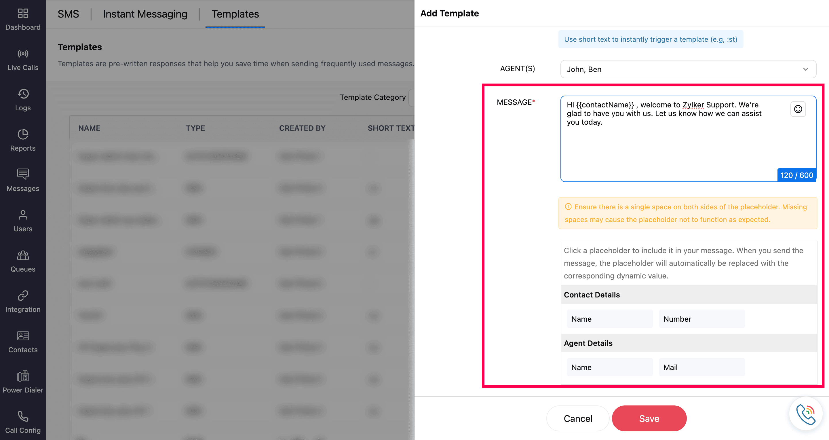 In this example, {{contactName}} is a placeholder. When the agent uses this template in an message conversation, the placeholder will be replaced with the contact’s actual name, such as "Ria".