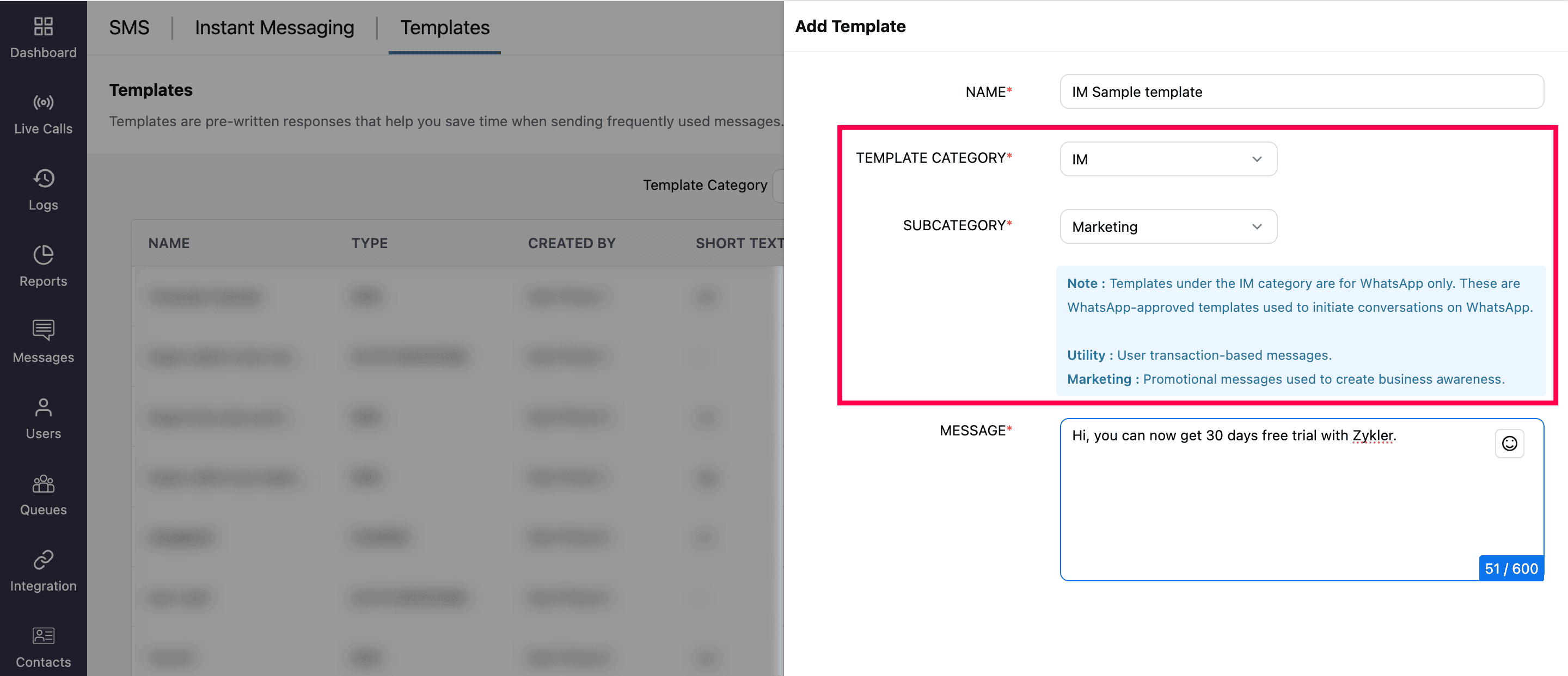 IM: Used only for Instant Messages (WhatsApp). These are WhatsApp-approved templates used to initiate conversations on WhatsApp.