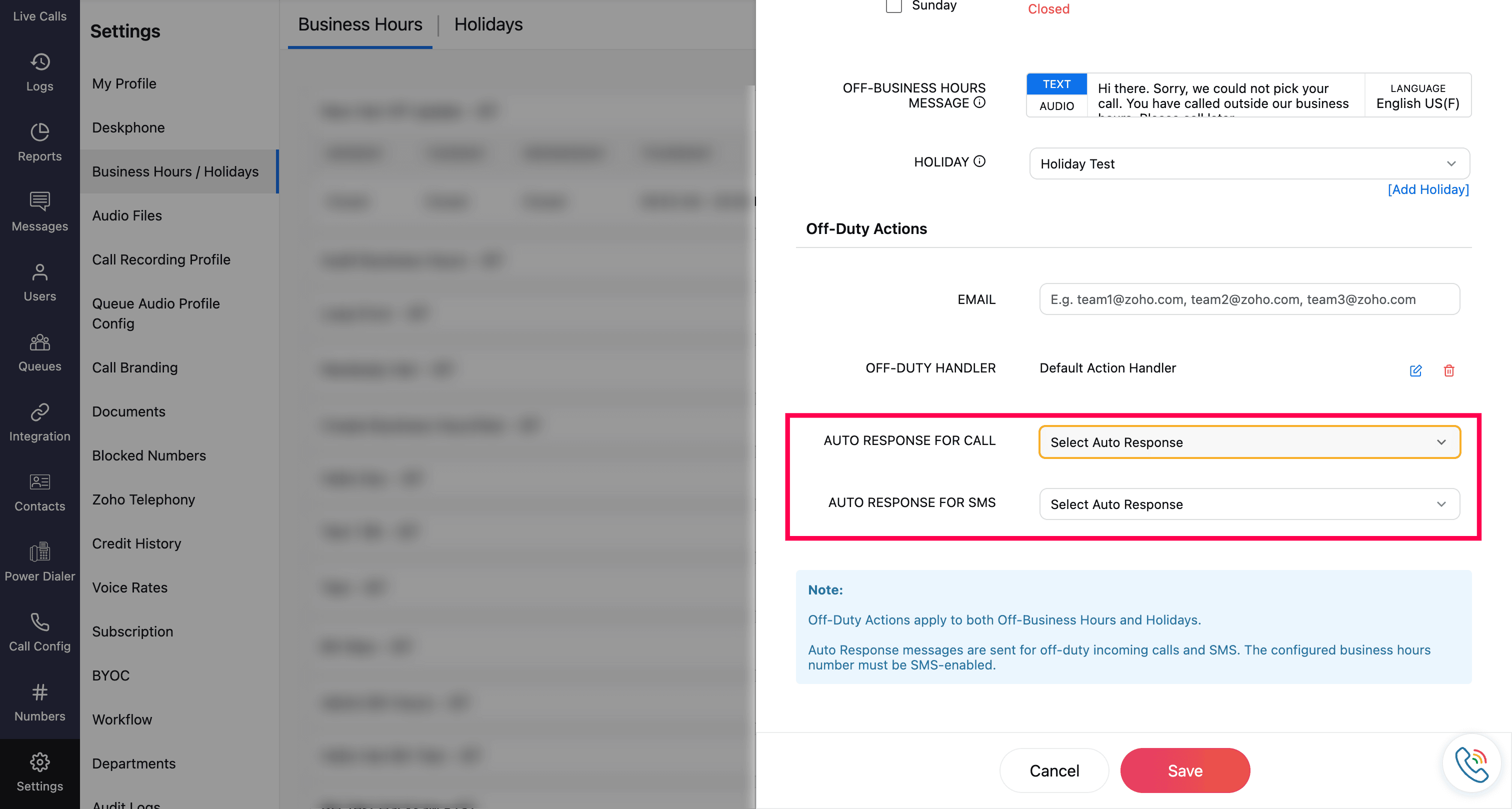 Auto Response for Call: Select the auto-response template to send to customers who call outside business hours or on holidays.