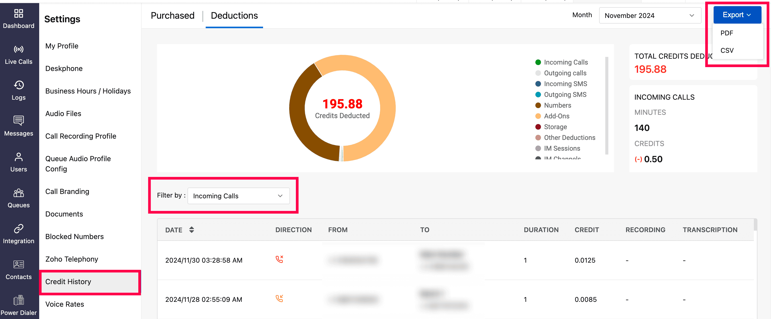 Based on the chosen month, you can view a donut chart that visually represents the credits deducted for various activities. You can also filter the history by incoming calls, outgoing calls, incoming SMS, outgoing SMS, numbers, add-ons, storage, IM sessions, IM channels, or other deductions.