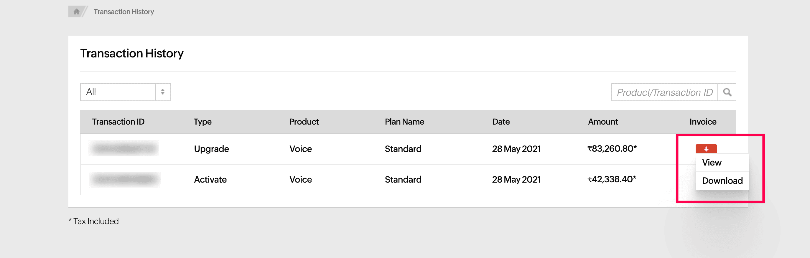 - Use the search bar in the top right corner to find transactions by Product/Transaction ID. Simply enter the ID and click Search to view the matching results.