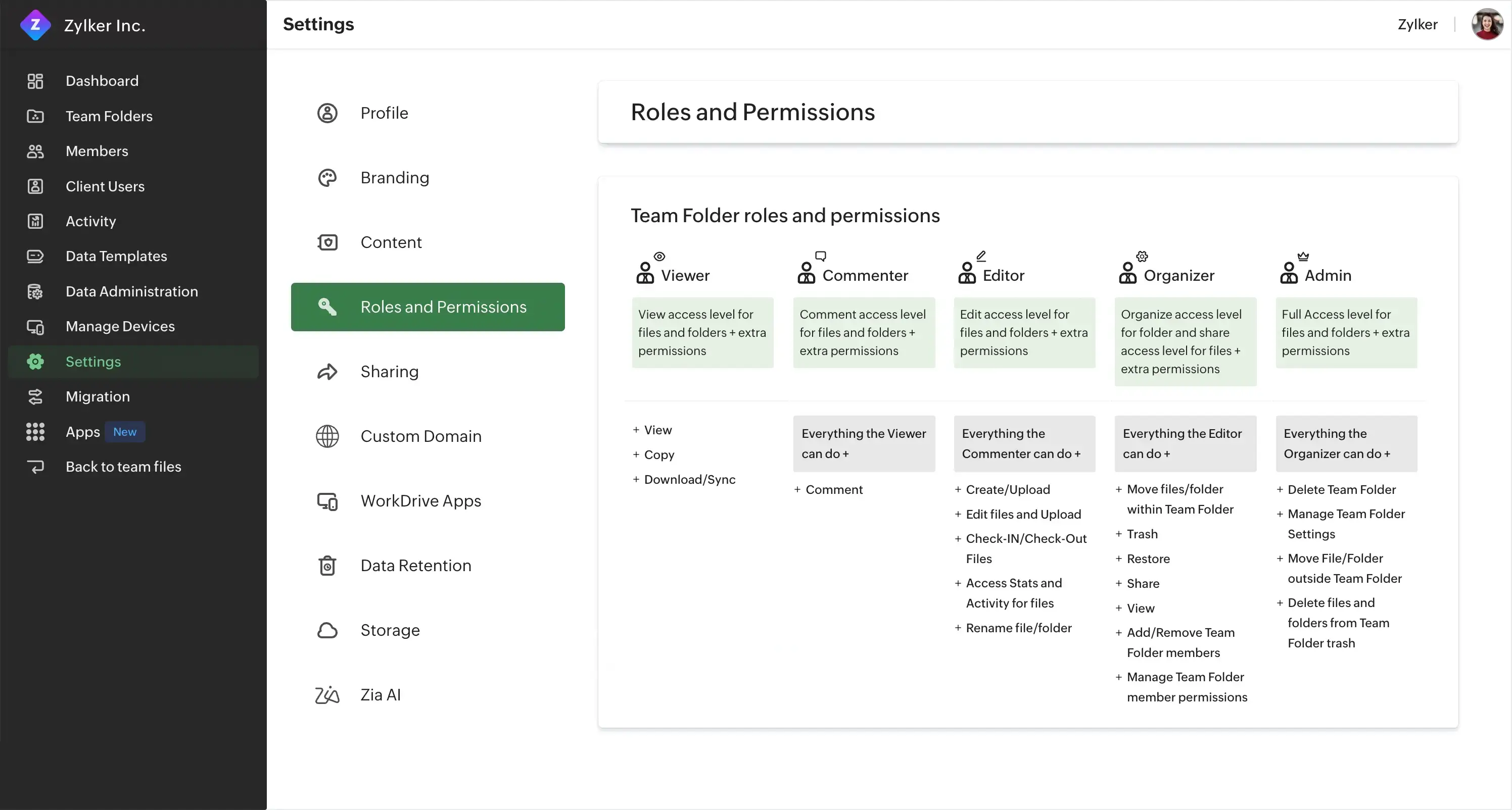 Every member of a team has their own role. WorkDrive supports multiple roles and granular access control. Give your users the right access permissions for secure and effective collaboration.