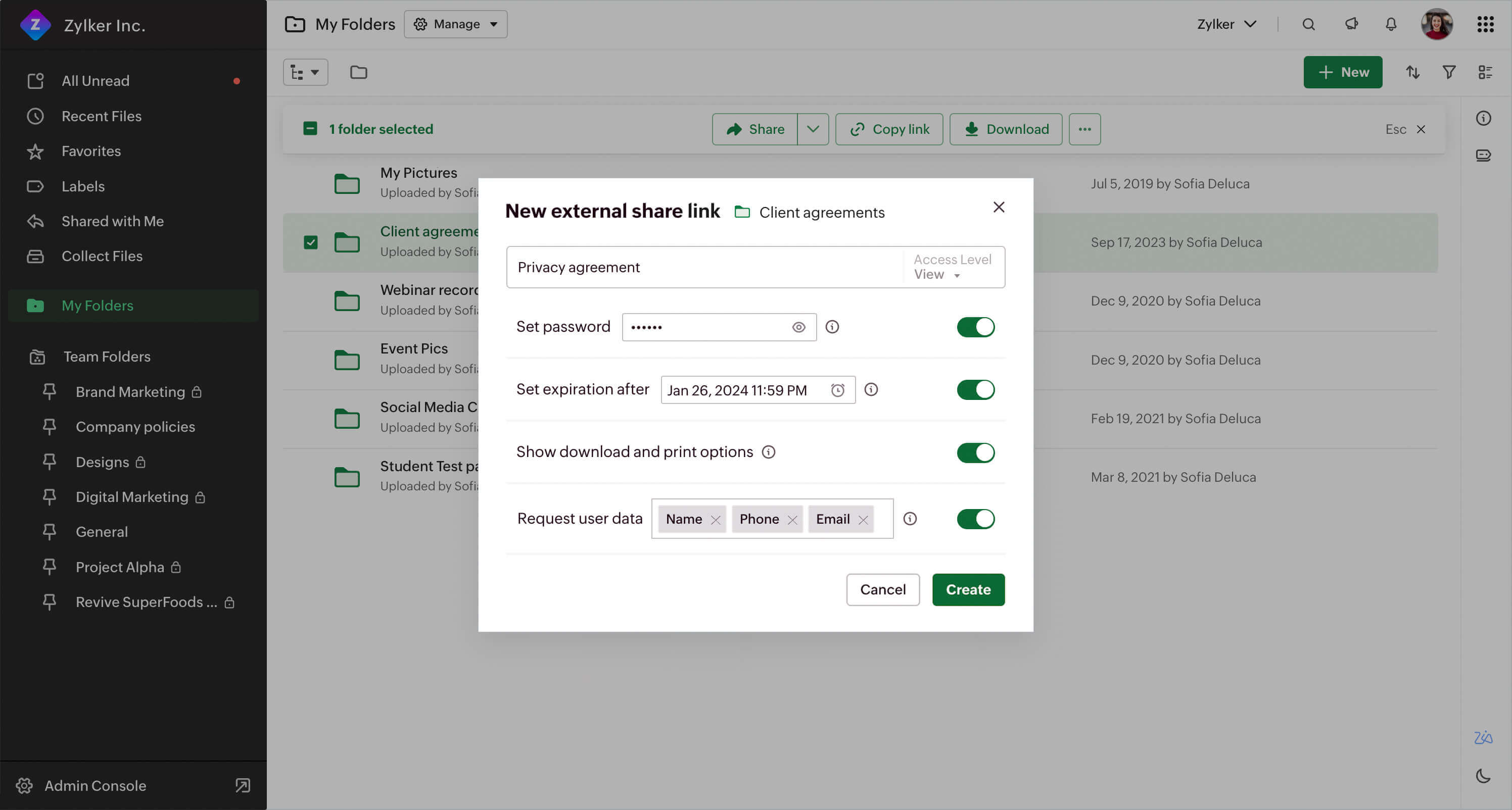 Share sensitive files with clients, stakeholders, or any necessary third party with custom control options, like download limits, expiration dates, and password protection.
