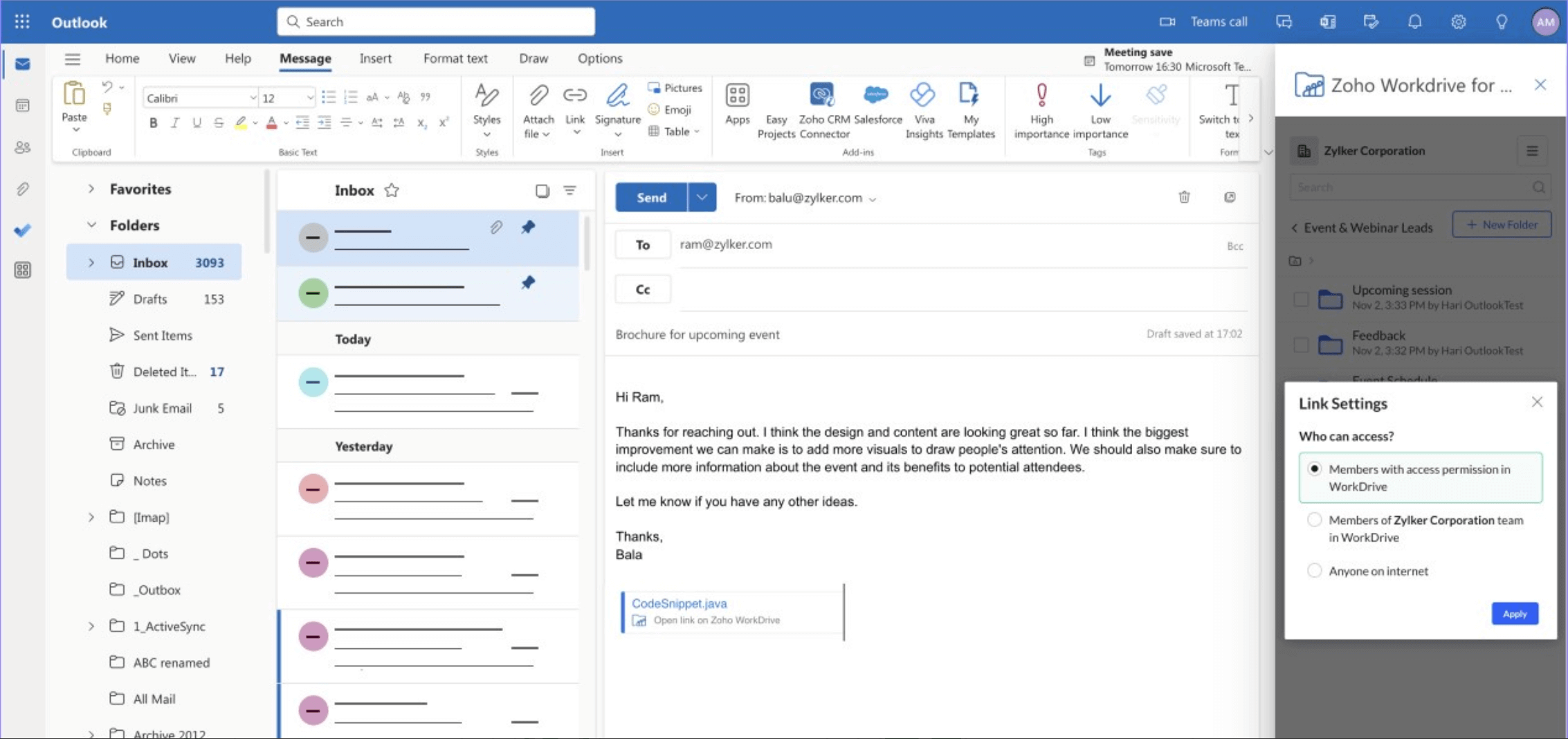 WorkDrive simplifies email attachments by making it easy to upload files directly to Outlook as attachments and instantly share them with coworkers or clients. On the flip side, you can also easily save attachments to WorkDrive to manage files sent by collaborators.