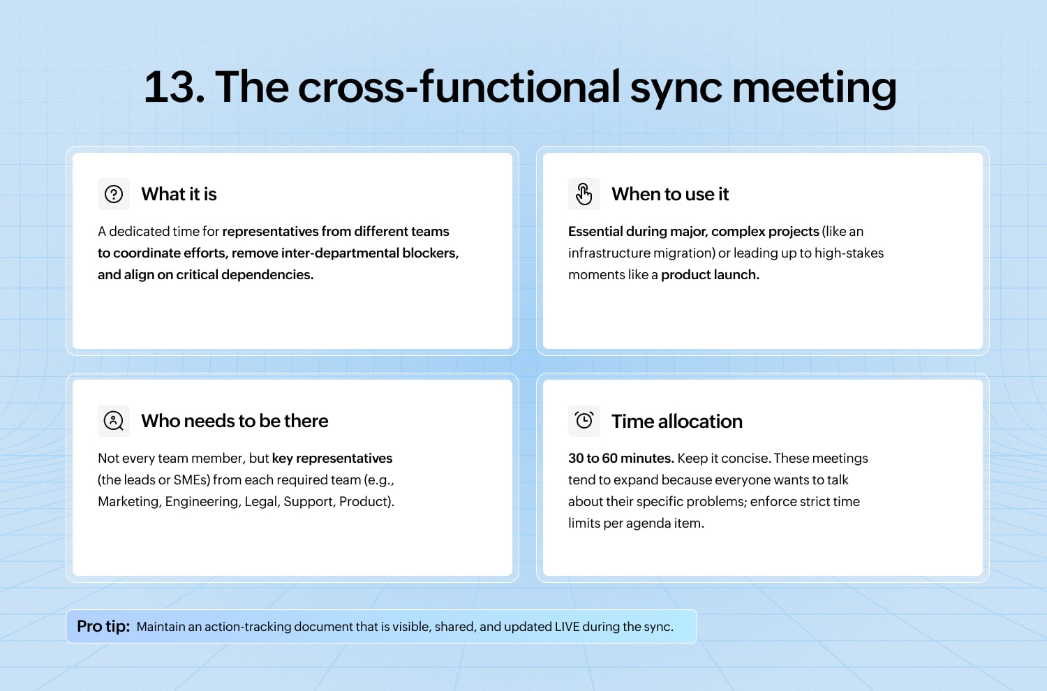 The cross-functional sync is the meeting dedicated to ensuring that the marketing team isn’t launching a product that the engineering team hasn’t actually finished, and that sales isn’t selling a feature the legal team hasn’t approved.