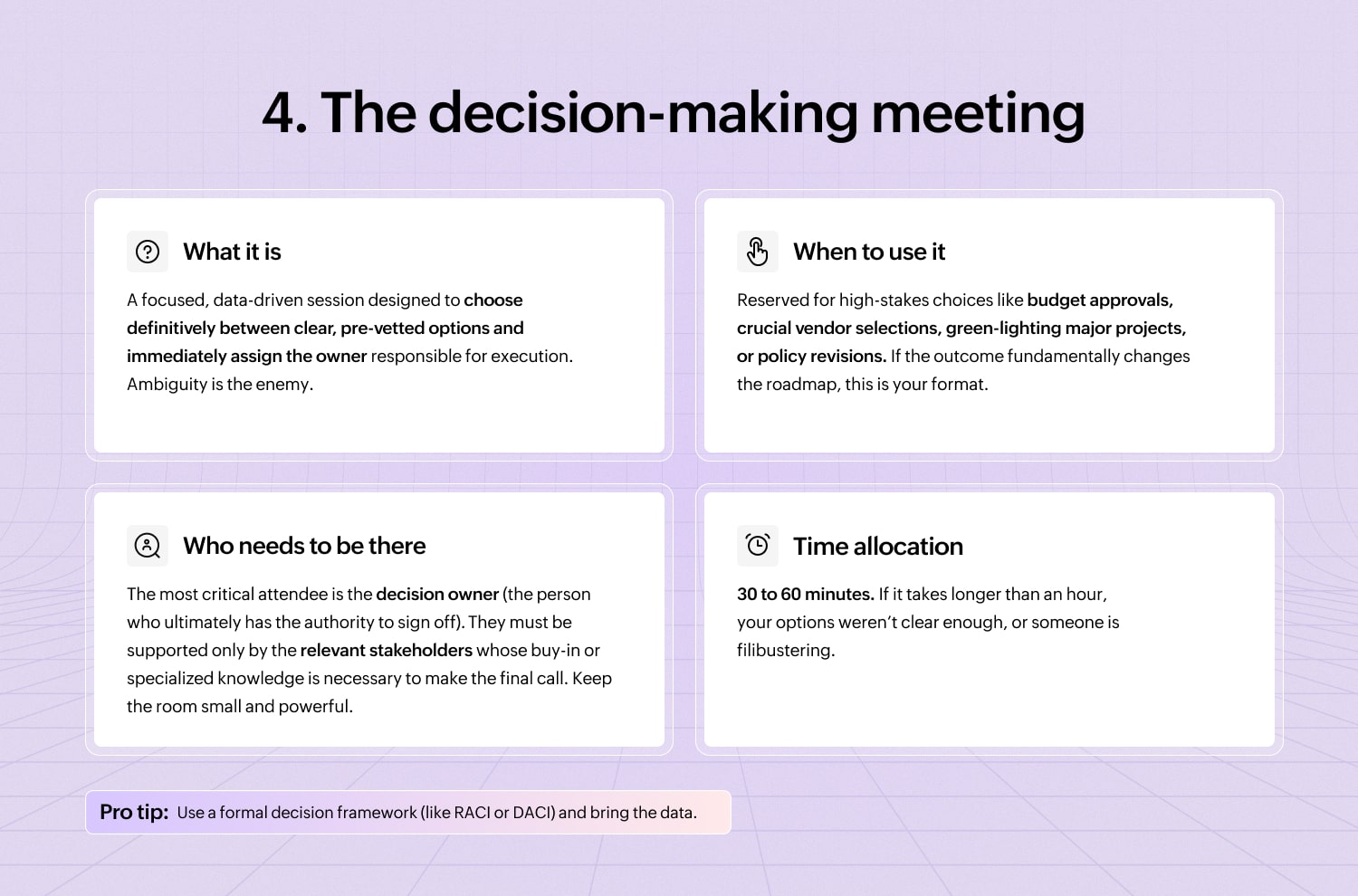 Do we need definitive, actionable decisions? | Decision-making meeting | If the outcome isn’t final, it’s just talk. Structure the meeting around voting and committing, not endless debate. |