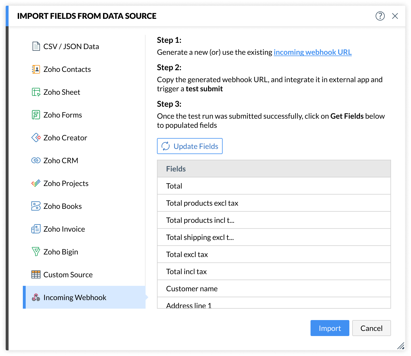 Zoho Writer lets you generate documents using data received through incoming webhooks. With this approach, you can retrieve fields by triggering a test webhook, design your document template using those fields, configure how the output should be delivered, and automatically trigger the merge using the same webhook URL.