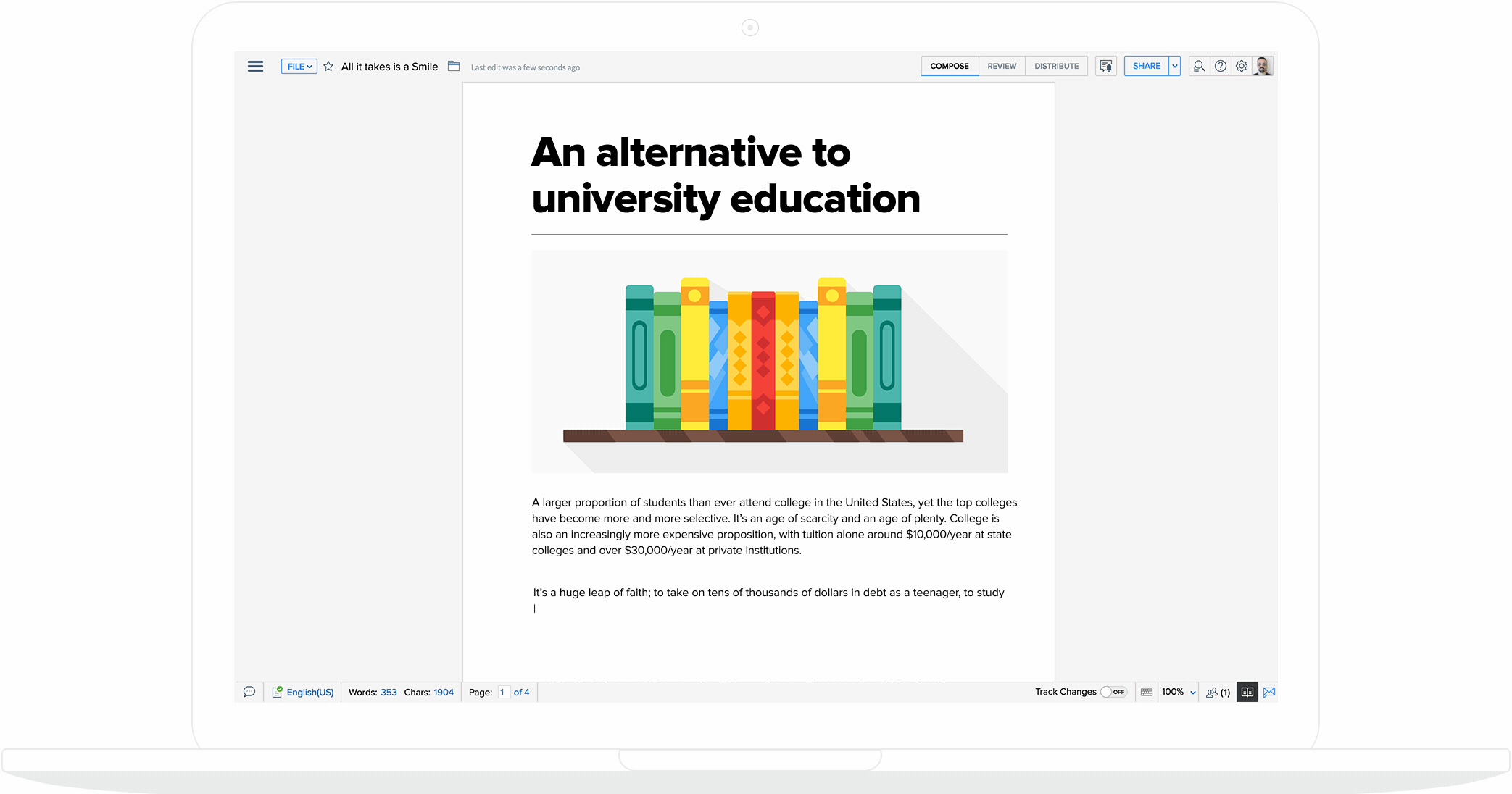 Don't let connectivity decide how you work. Create and edit documents offline, and even close the tabs when you’re done—Writer saves everything automatically. Once you’re reconnected, all that work you did offline syncs to your account in a snap!