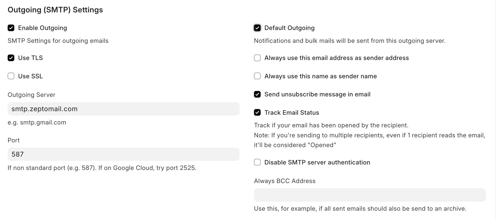 - Enter the outgoing server details. This will be the server name in the SMTP section of your ZeptoMail account.