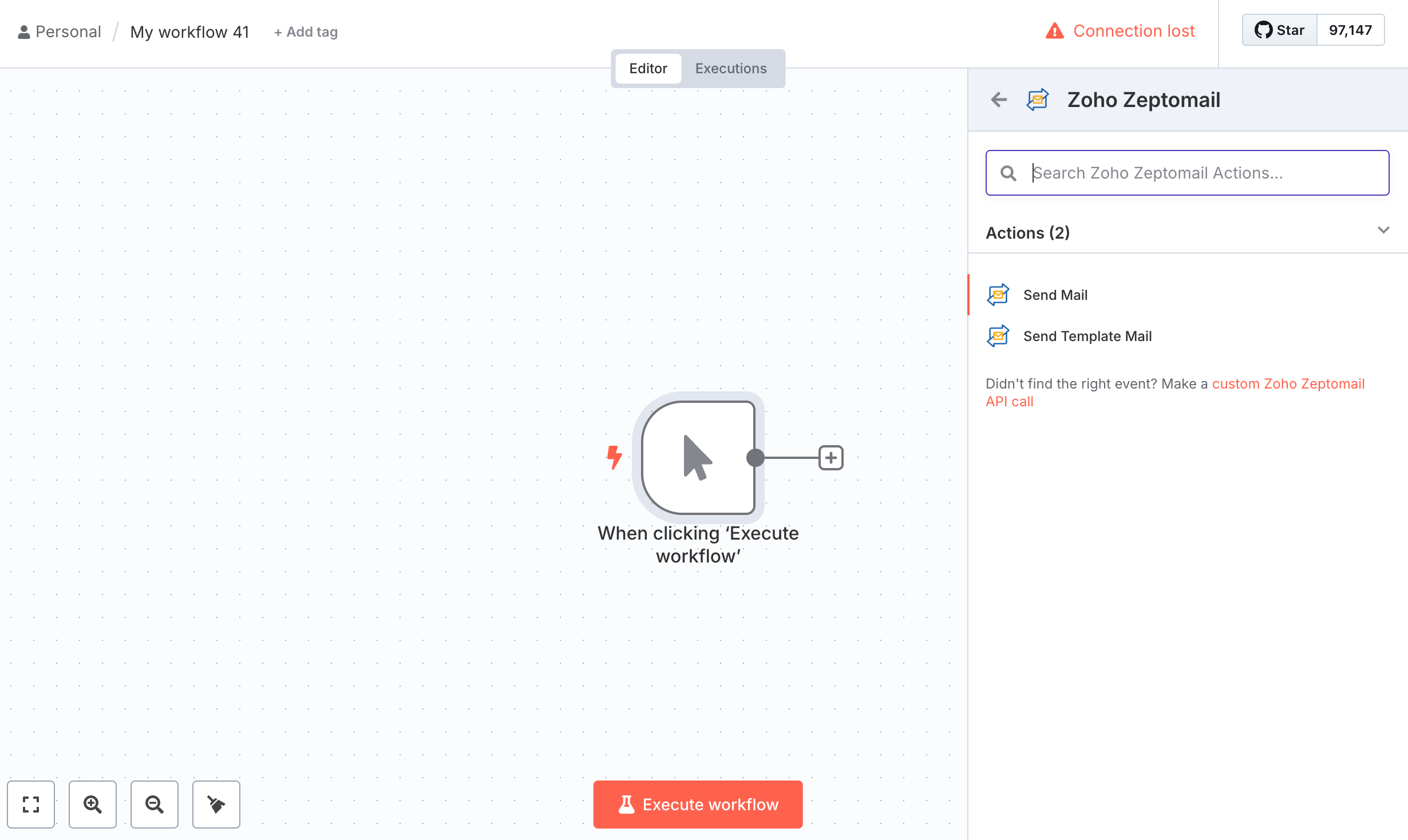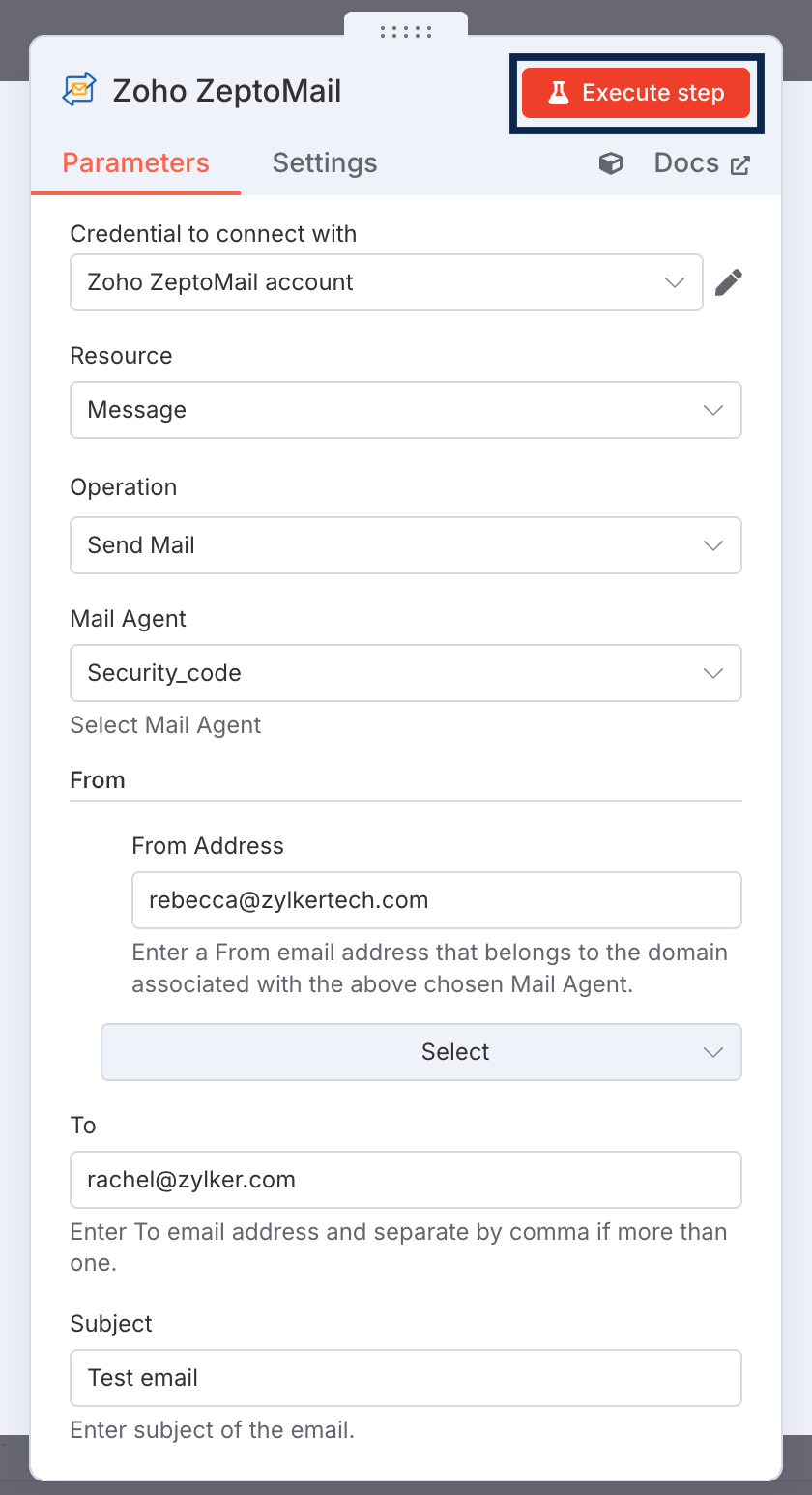 Applications using n8n for their workflows can add ZeptoMail as an action node to send transactional emails for a particular trigger. The supported actions are: