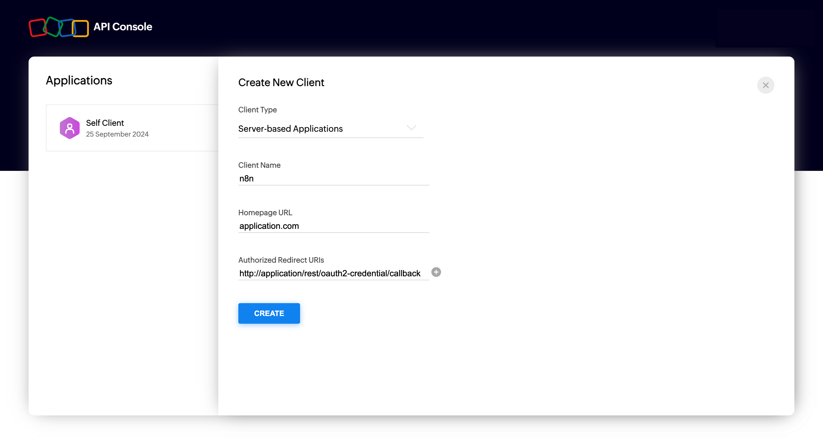 4. Provide an appropriate client name, the application url from where the connection has to be made, and the redirect URL copied from the Add credentials dialog box.