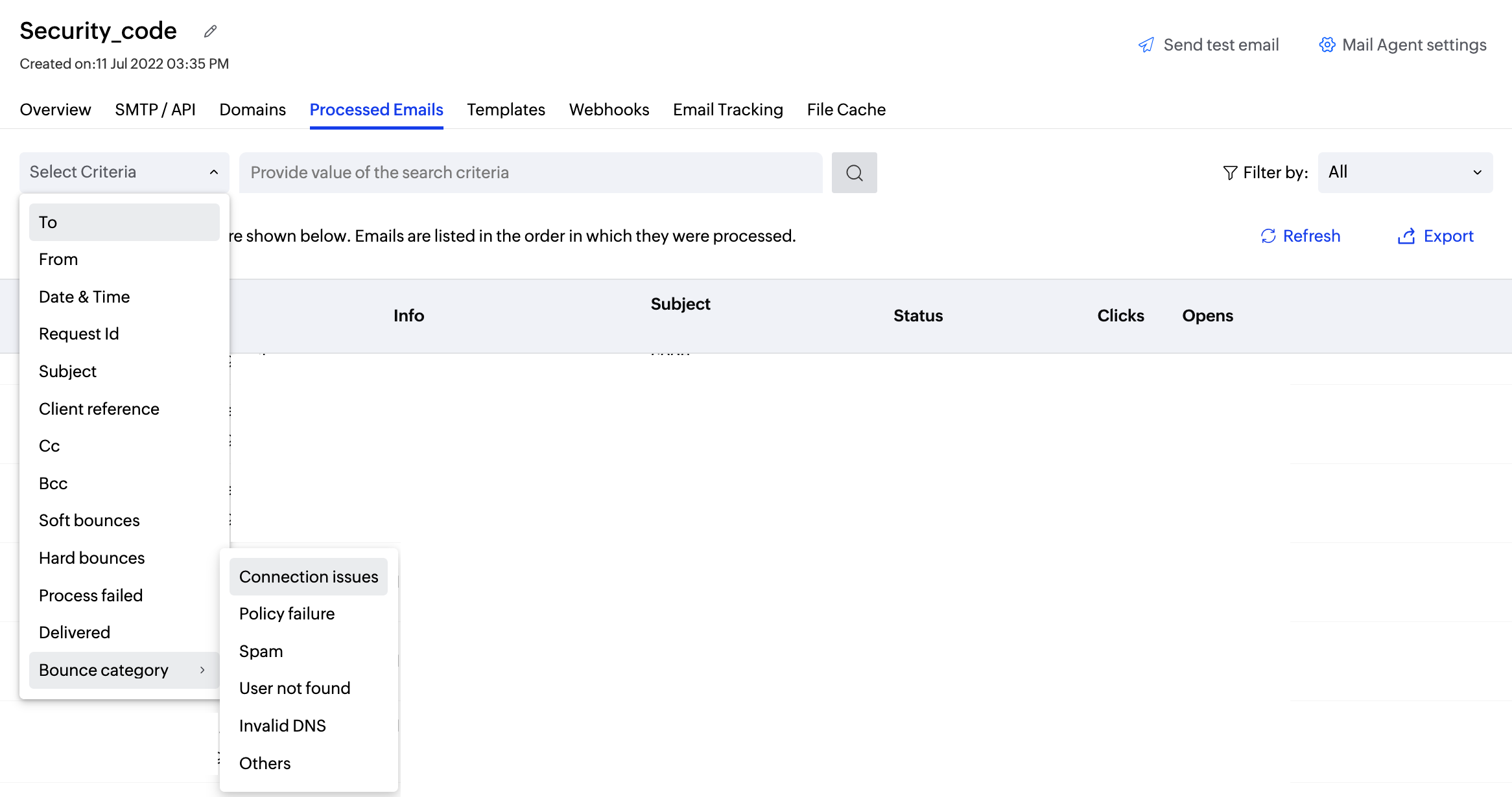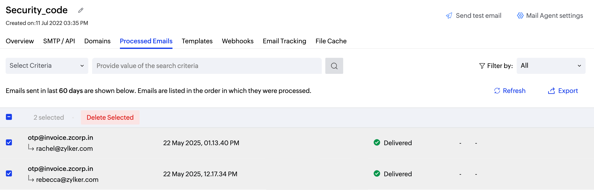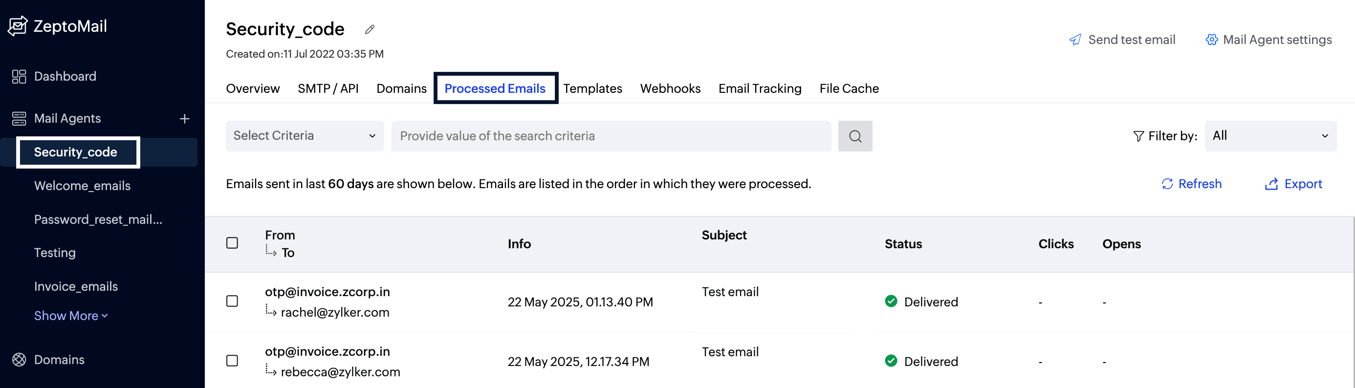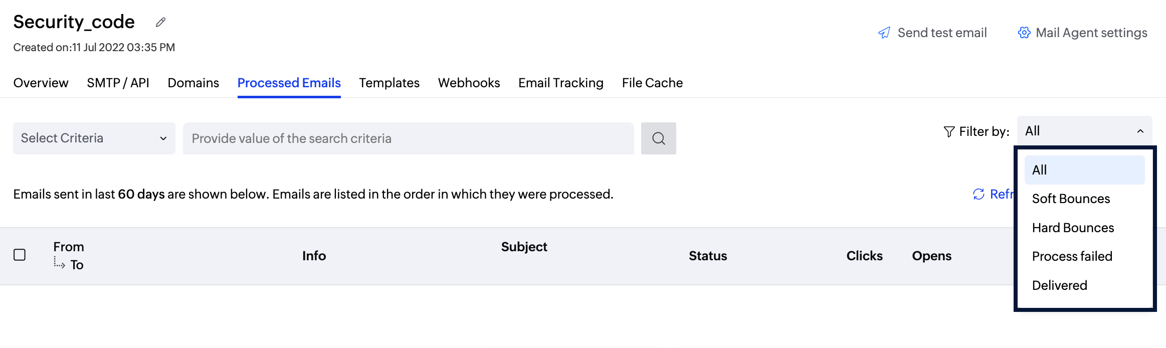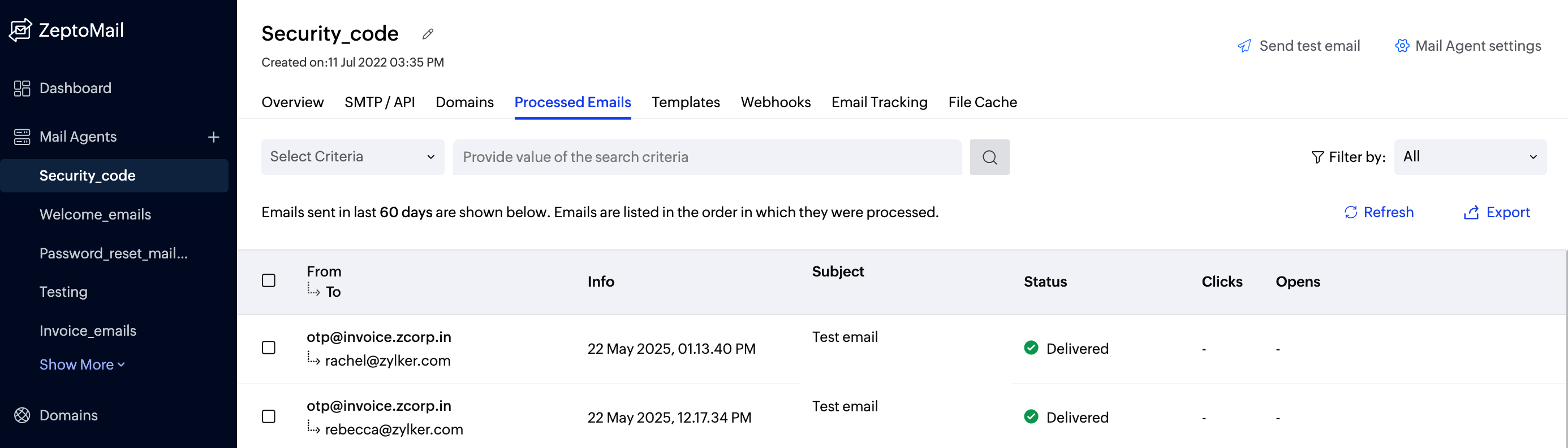 - Processed - Email was successfully sent from the ZeptoMail email server.