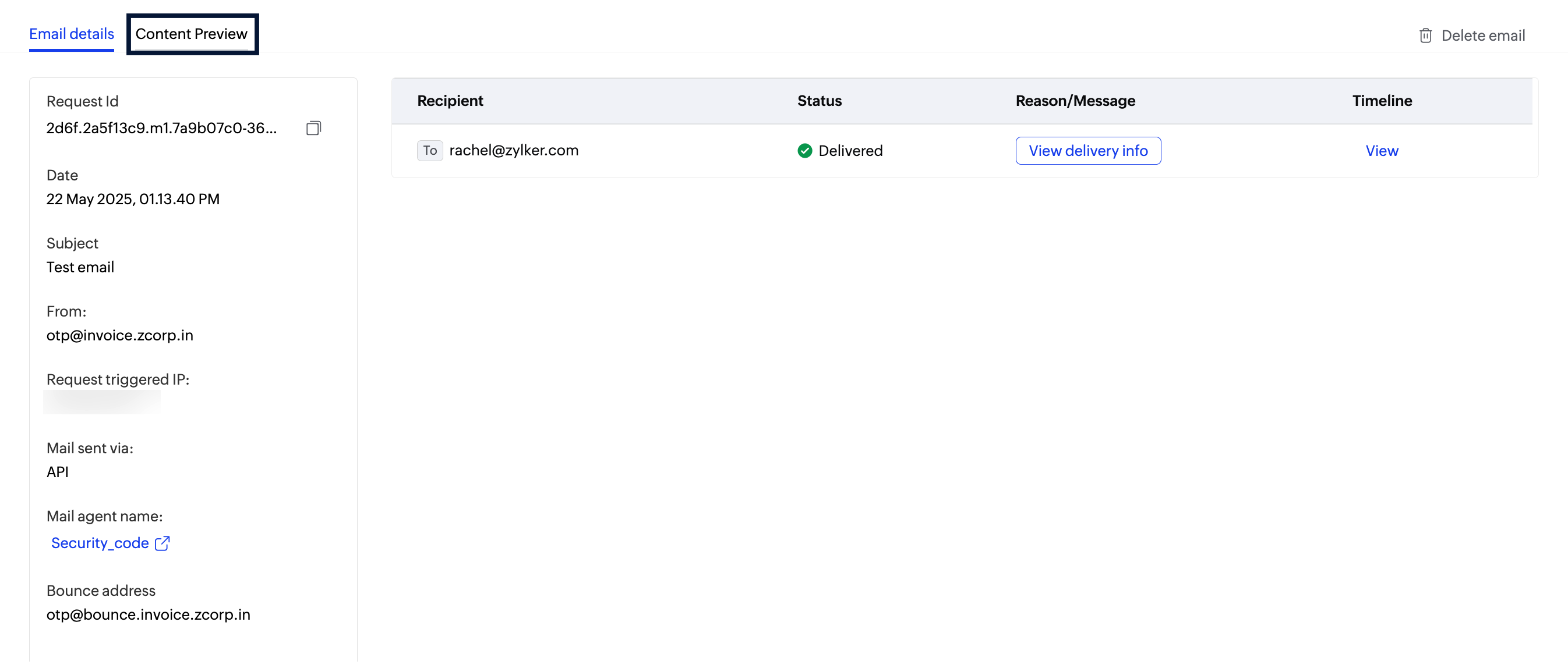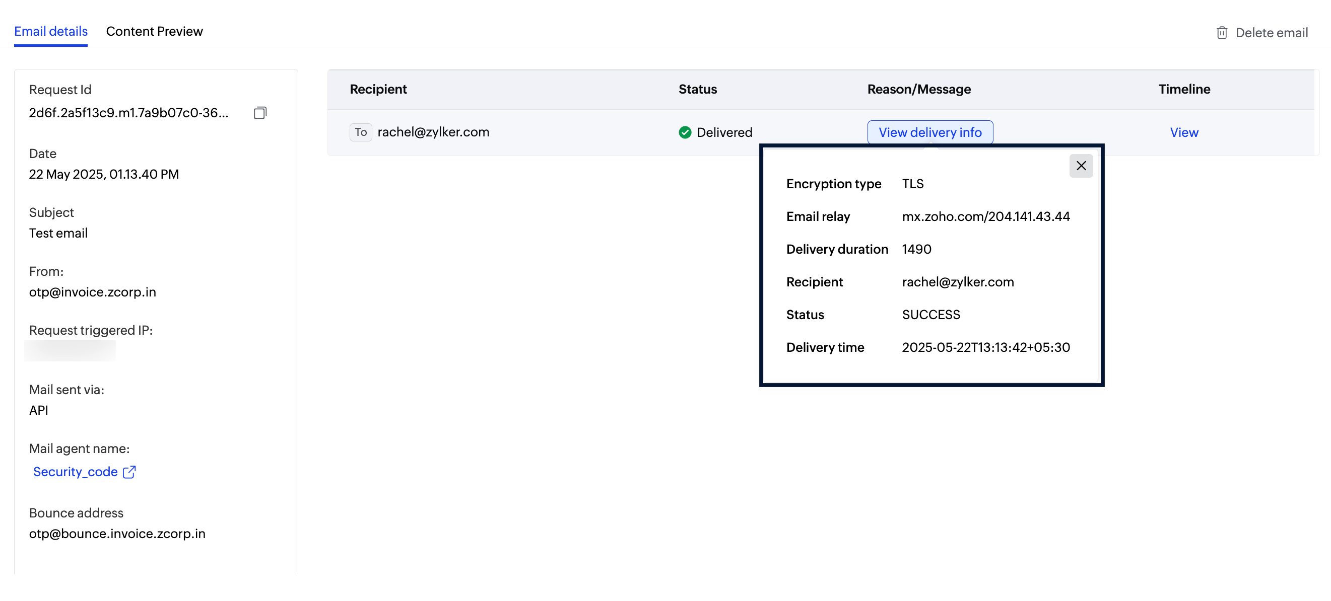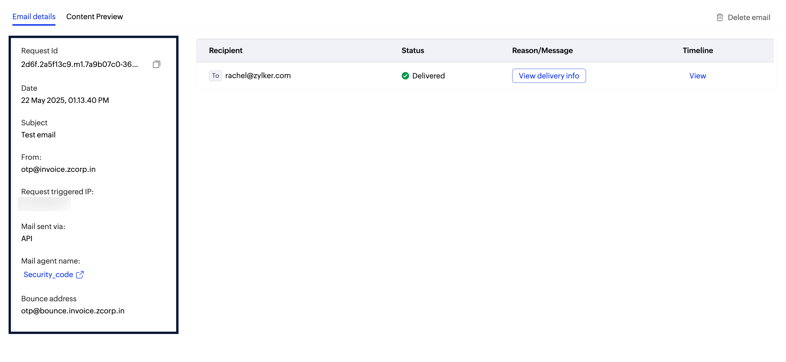 | Request triggered IP | Public IP from where the email was triggered to ZeptoMail's servers |