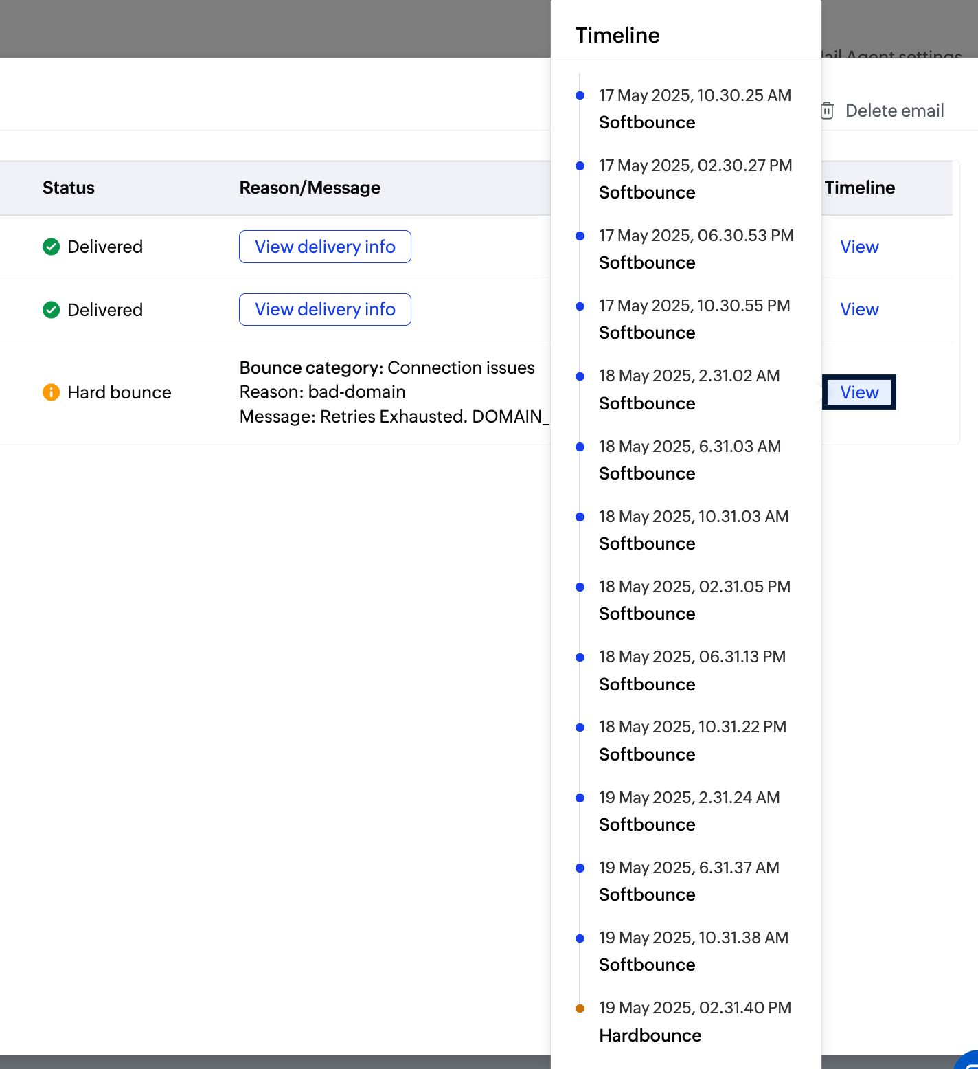 The timeline shows the path the email traversed before reaching the recipient. This information can be viewed in the Timeline column by selecting the View button. The timeline section accounts the different statuses the email takes once it is sent. An email takes one of the following statuses when it is sent from ZeptoMail.