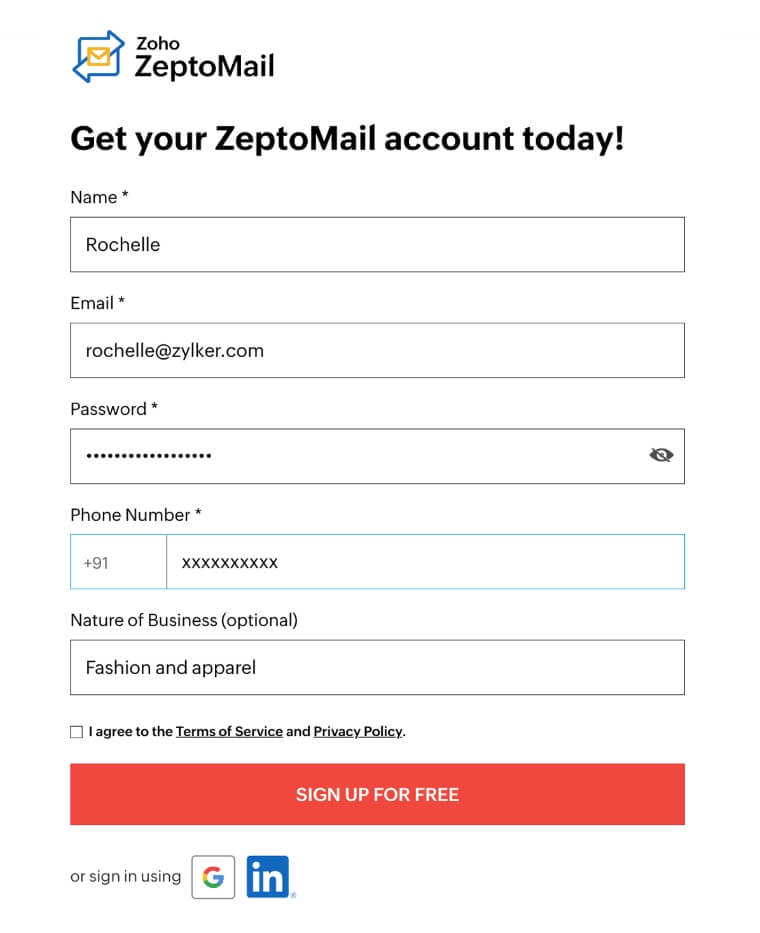 Sign up for ZeptoMail by entering the relevant credentials.