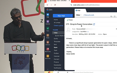 A meeting agent summarises a meeting that's about to start, with info about who is going to attend, and also an open ticket in Desk for better context. This highlights the beauty of the Zoho ecosystem and how AI can take that a notch further. Because the customer information across different functions is readily available, and the AI agent picks up the relevant information from all these buckets at the most appropriate time to weave a meaningful story.